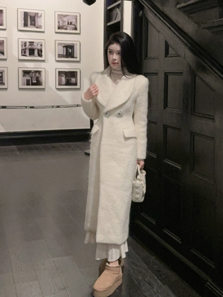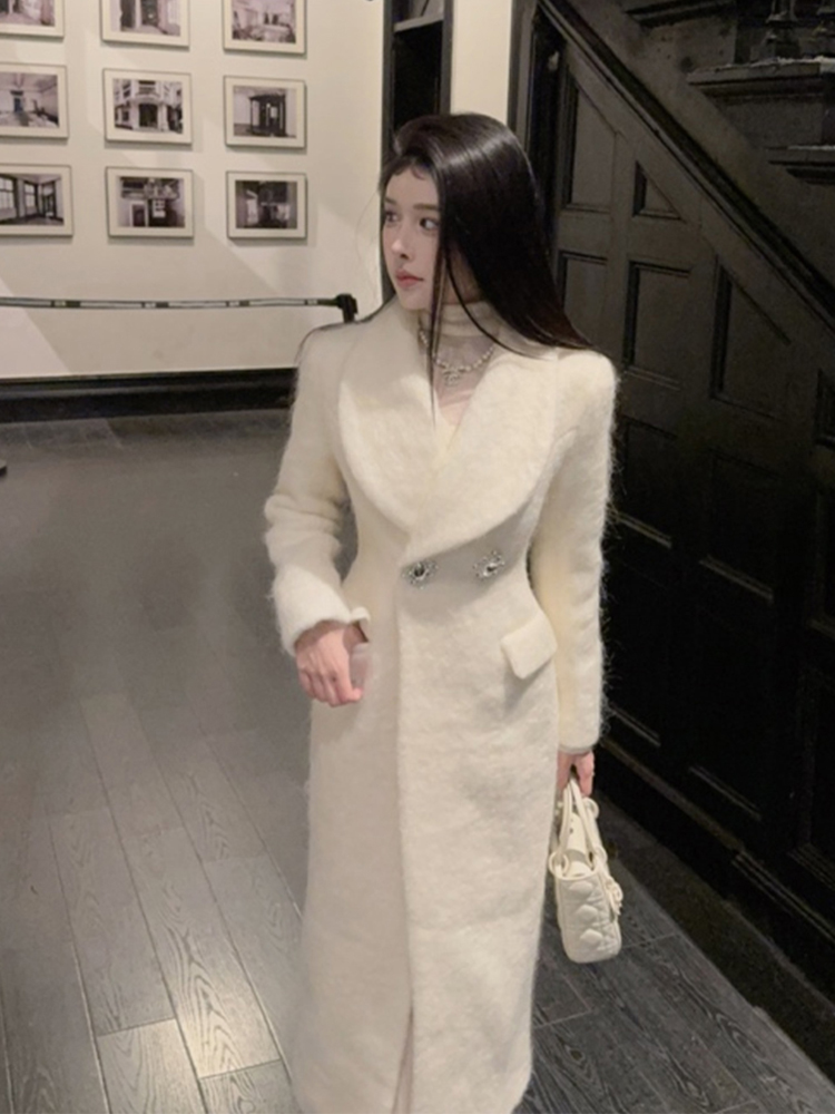 大码气质名媛赫本风白色加厚毛呢外套女秋冬季中长款收腰呢子大衣