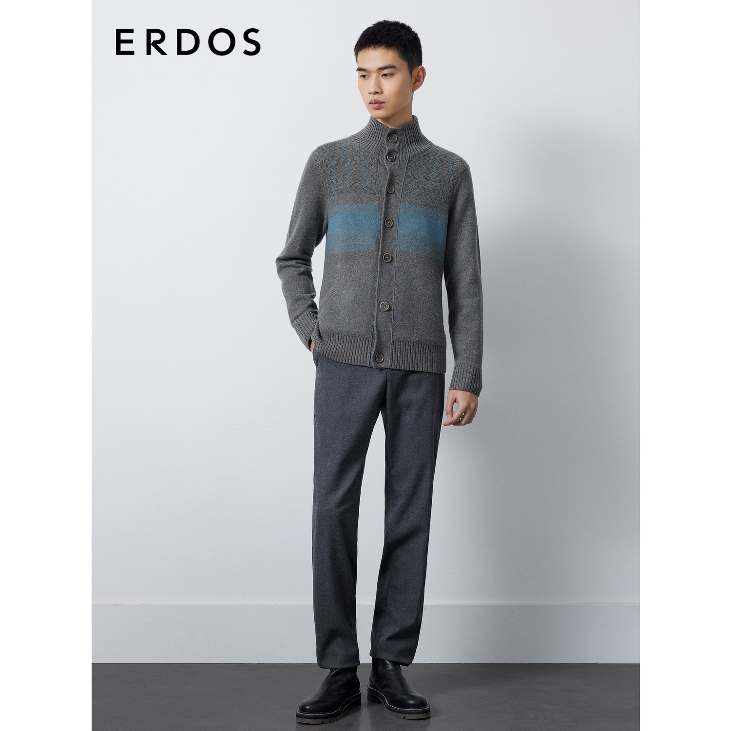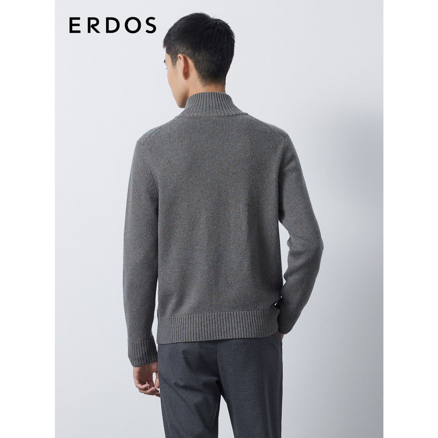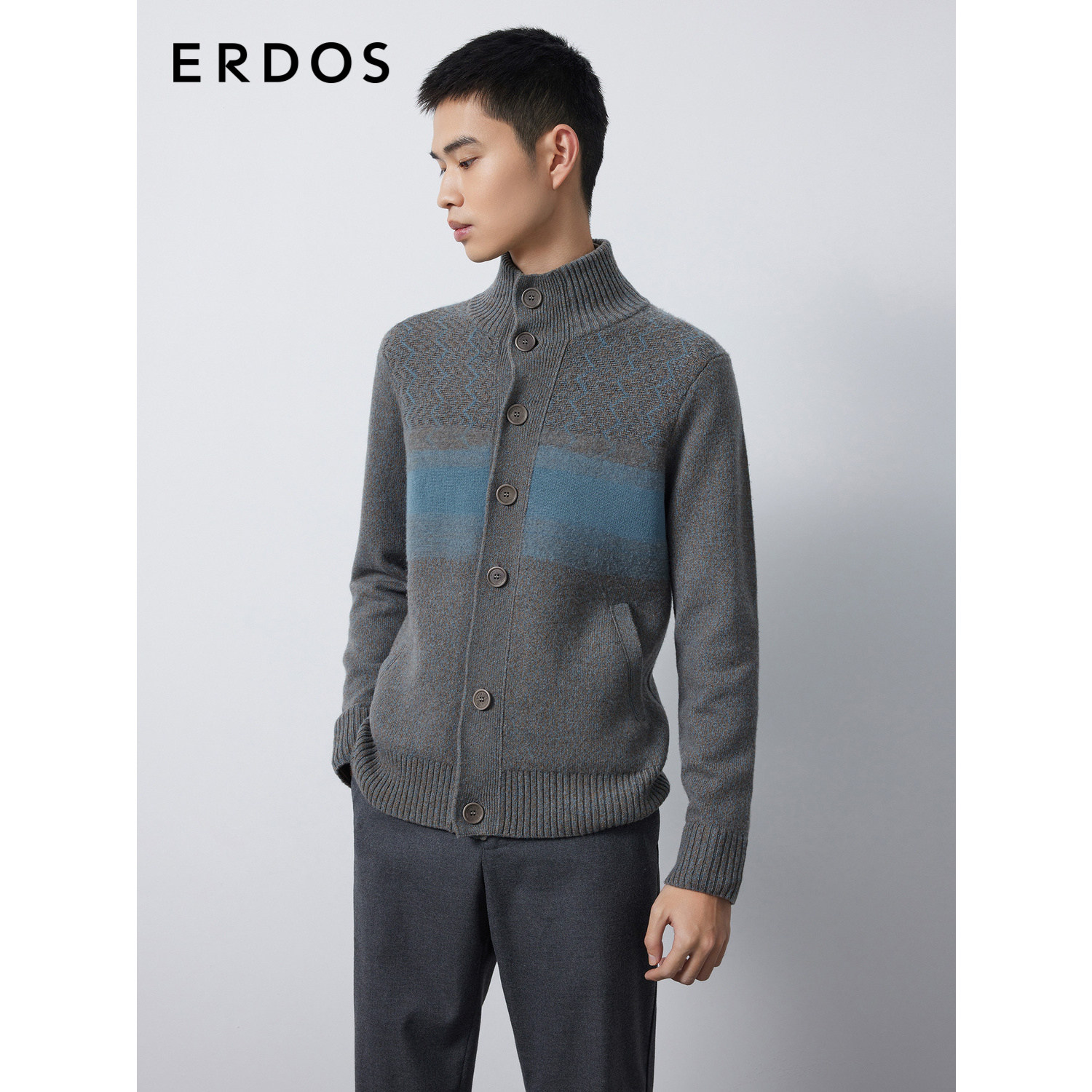 ERDOS 男装羊毛羊绒混纺开衫秋冬花蓝色高领厚款微弹针织衫