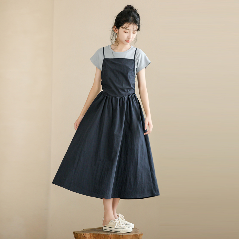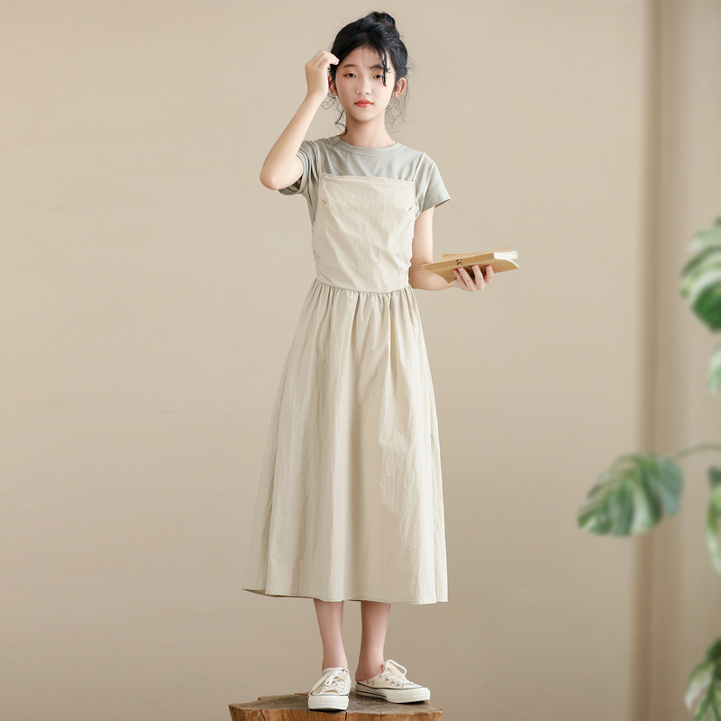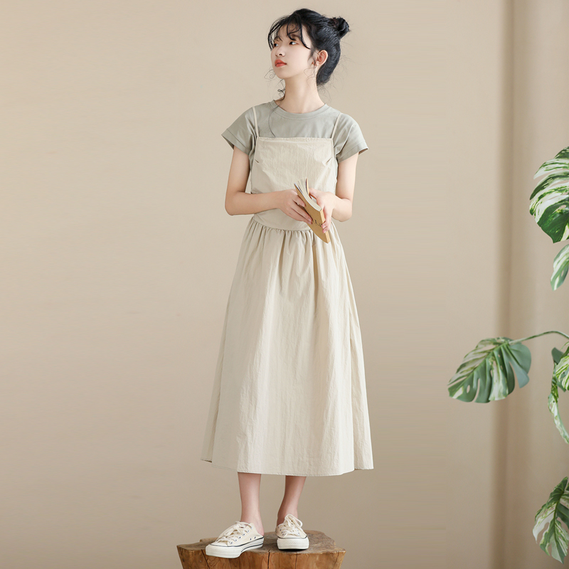 设计感日系文艺学院风短袖吊带裙两件套少女初中生t恤连衣裙套装