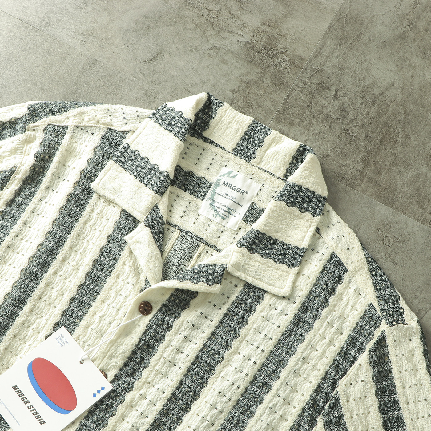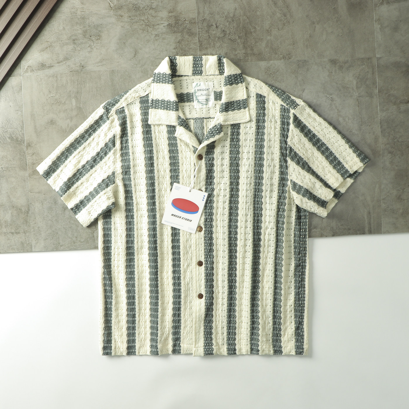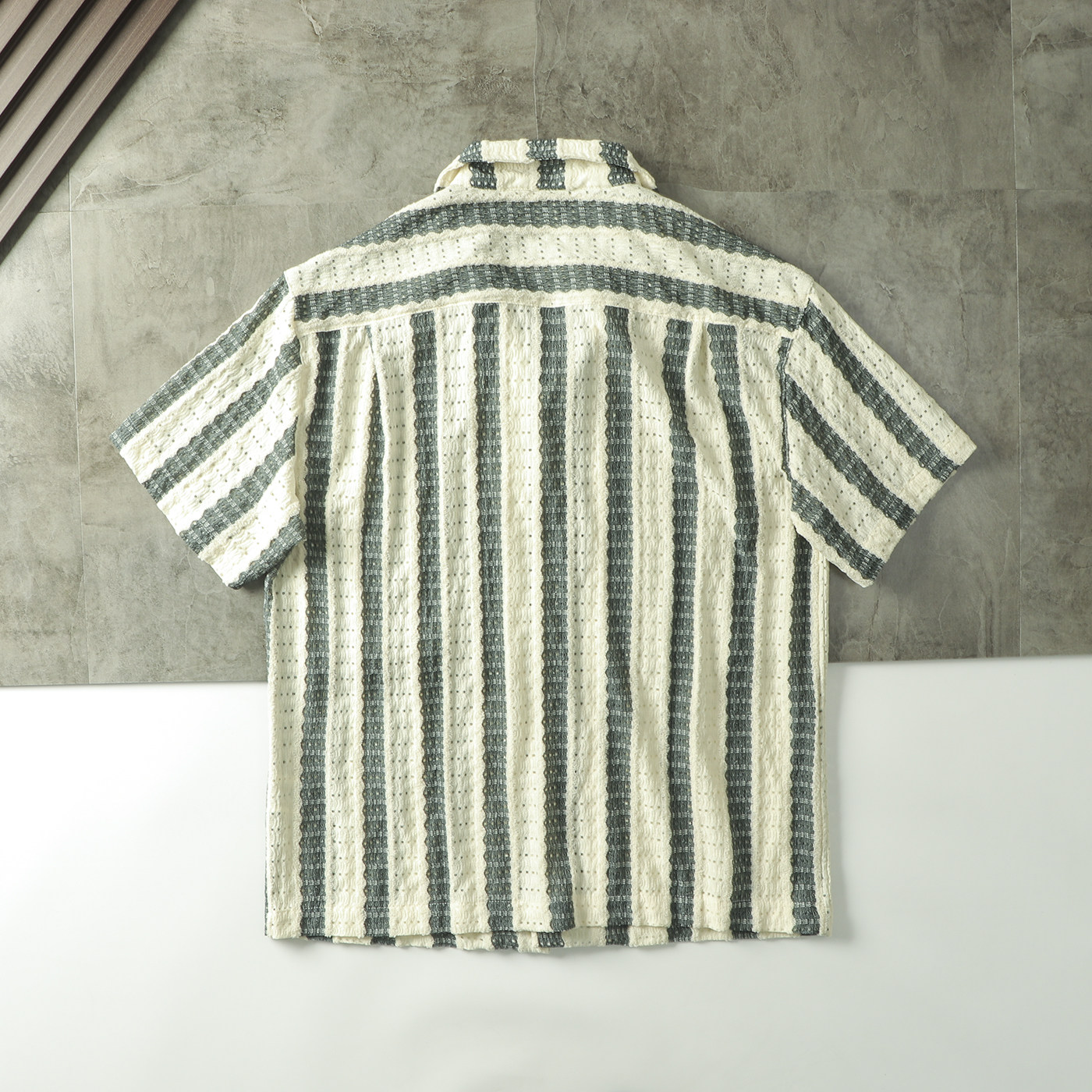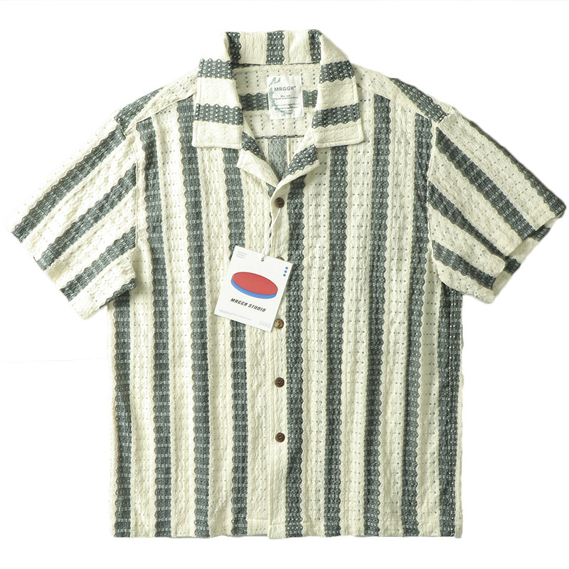文艺雅痞帅复古港风钩编镂空提花条纹古巴领短袖衬衫宽松休闲衬衣