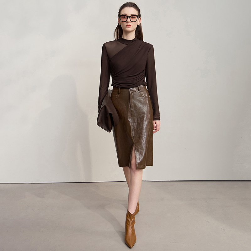 Amii2025秋新款极简气质圆领修身弹力网纱针织透肤打底衫T恤女
