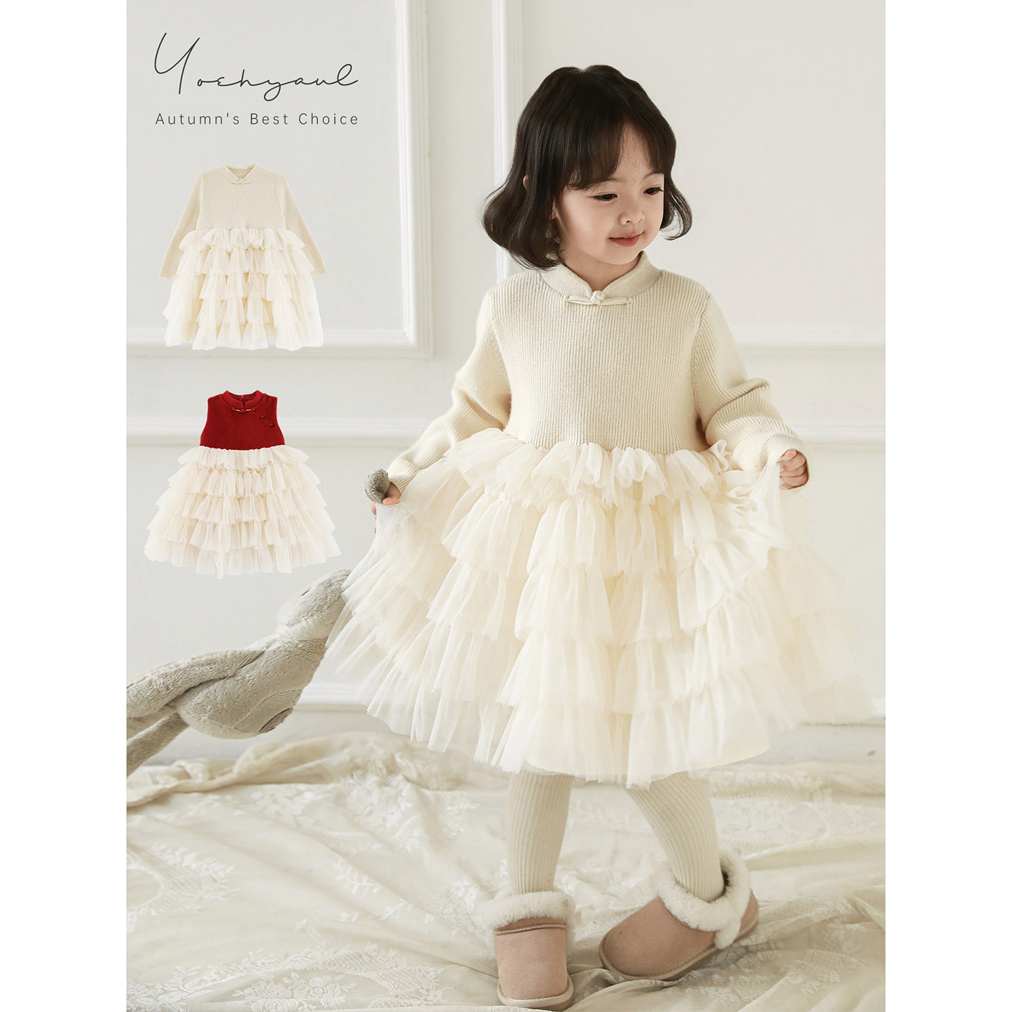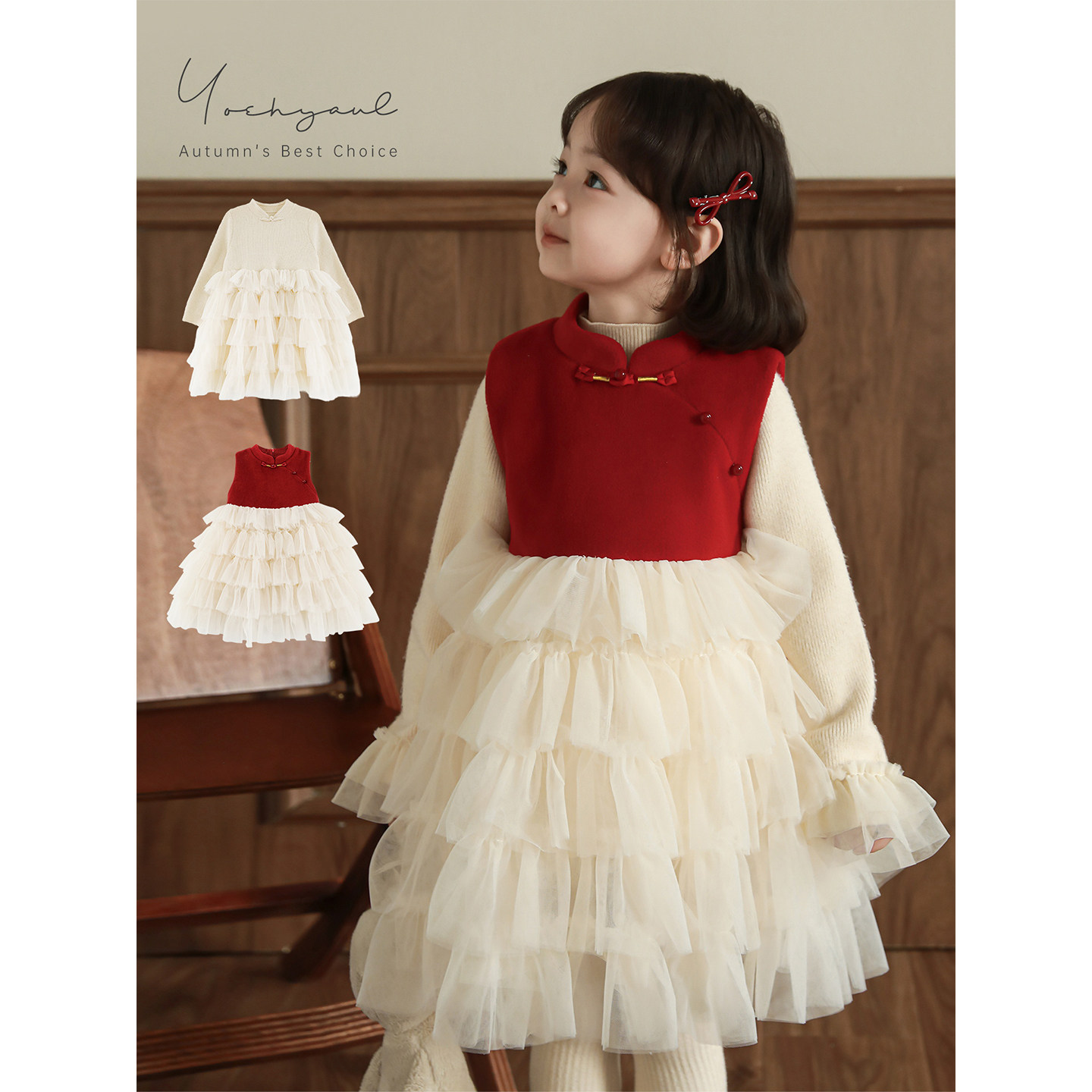 幼悠女童2025冬季新款中式盘扣网纱裙时尚保暖小女孩公主裙拜年服