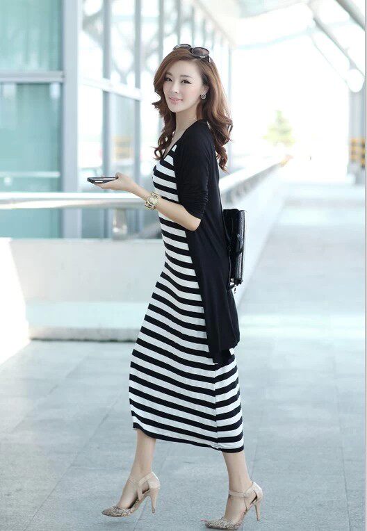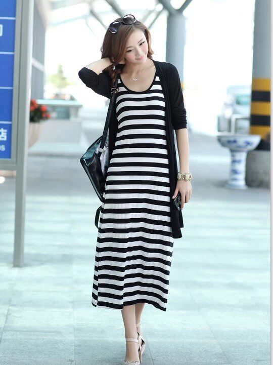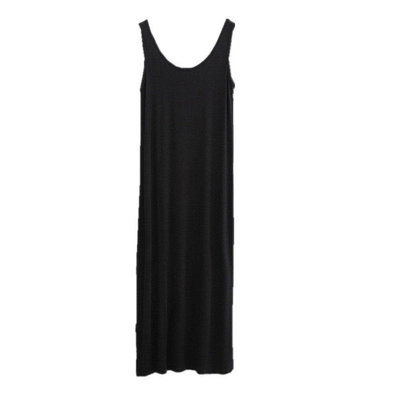 打底夏秋季吊带显瘦莫代尔长袖长裙黑白条纹无袖背心连衣裙