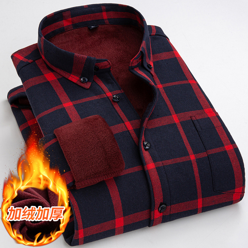 VF真维斯男装加绒保暖长袖衬衫男士格子上衣红色新年服男款衣服