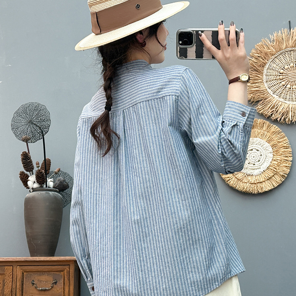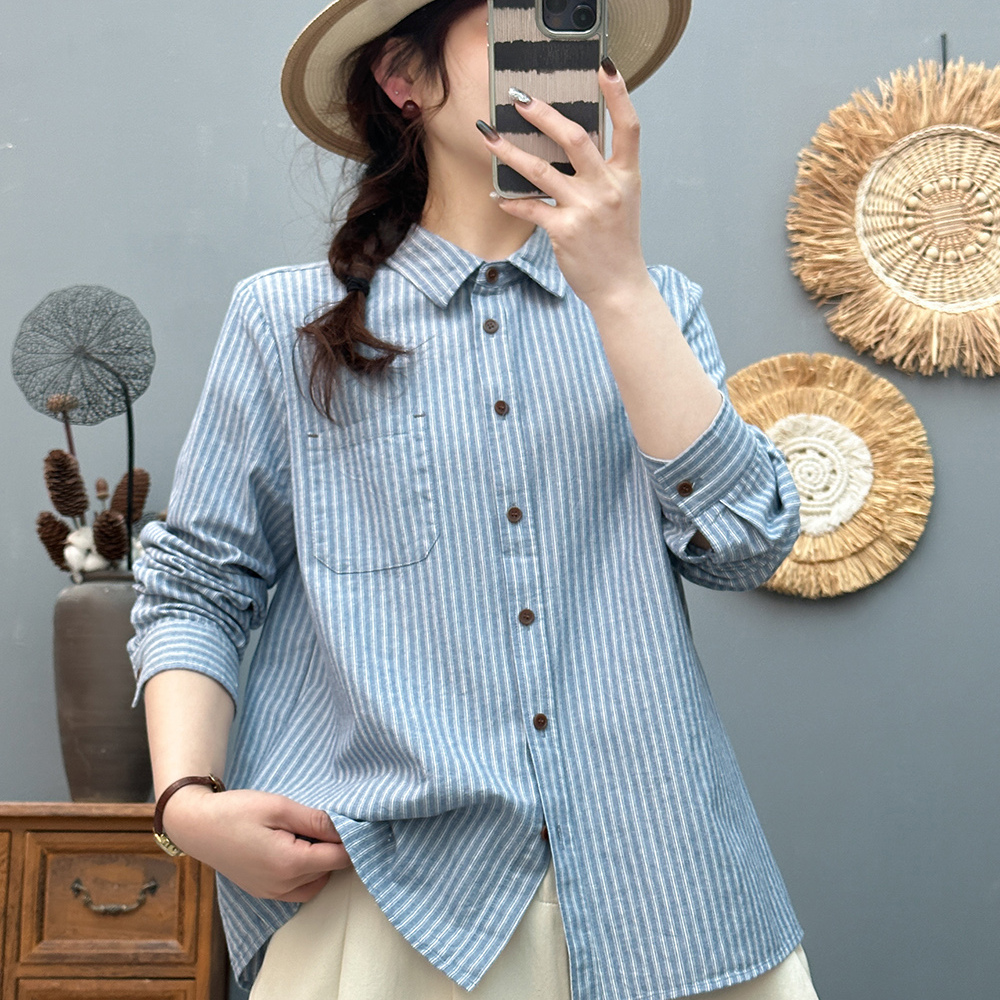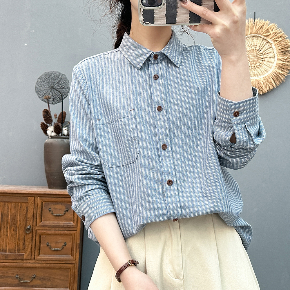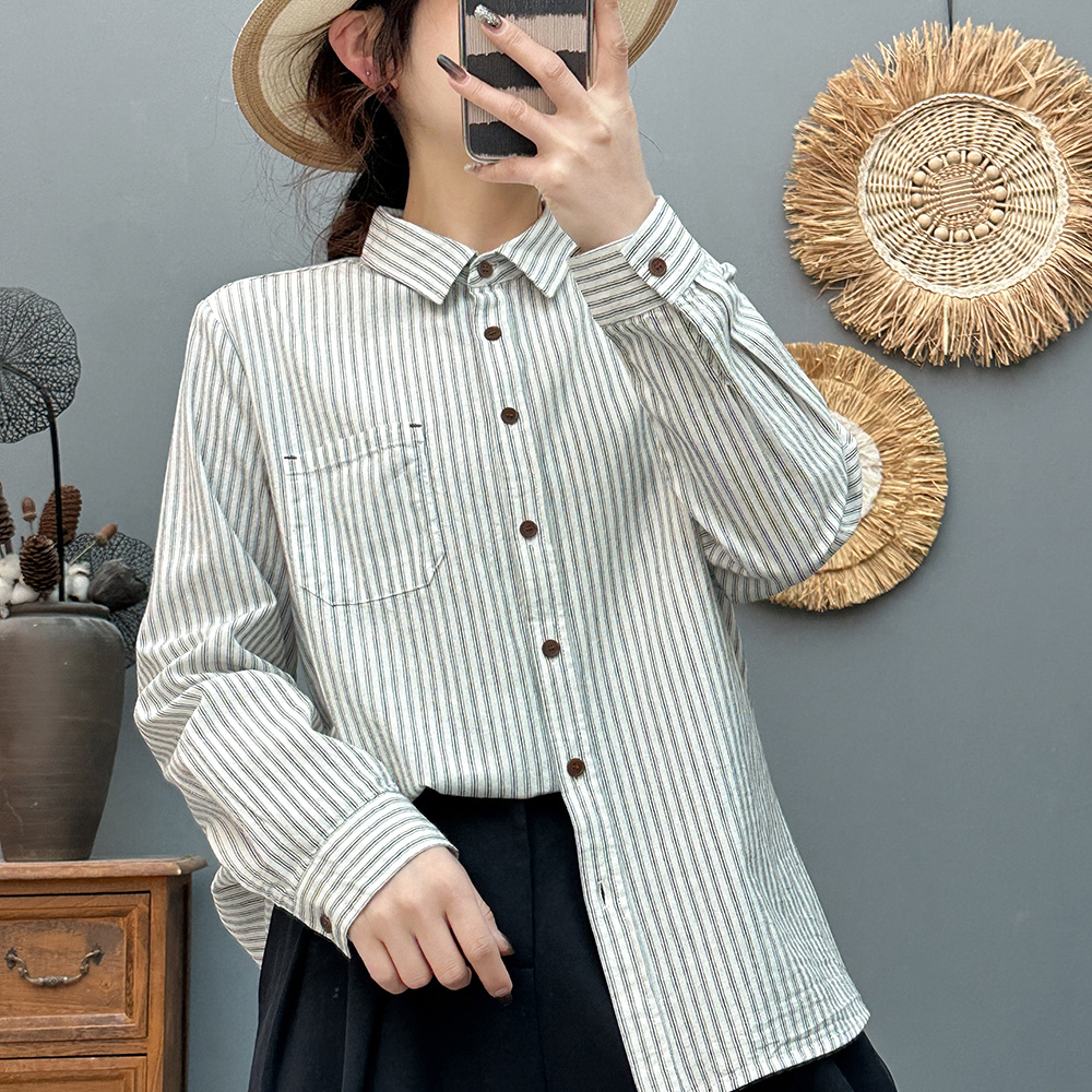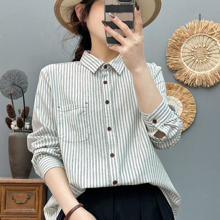 春秋装新款纯棉文艺条纹衬衫女长袖小清新衬衣女装上衣宽松显瘦