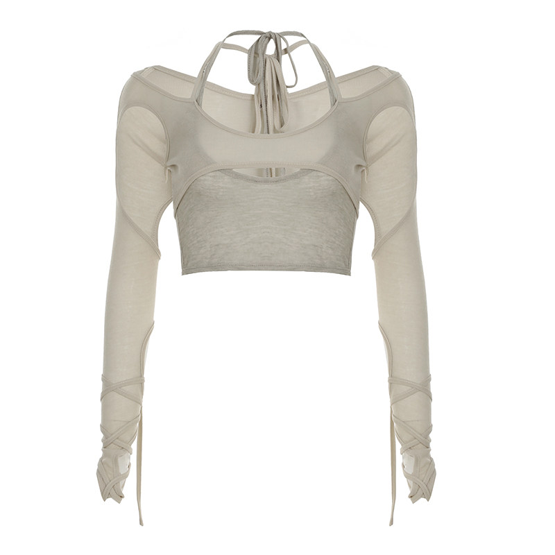 WEEKEEP 纯色解构镂空分割假两件挂脖绑带上衣女紧身长袖T恤跳舞
