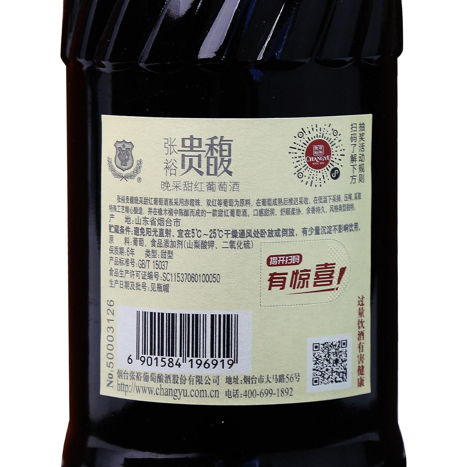【张裕官方】红酒单瓶甜红 贵馥晚采葡萄酒 女士酒甜型