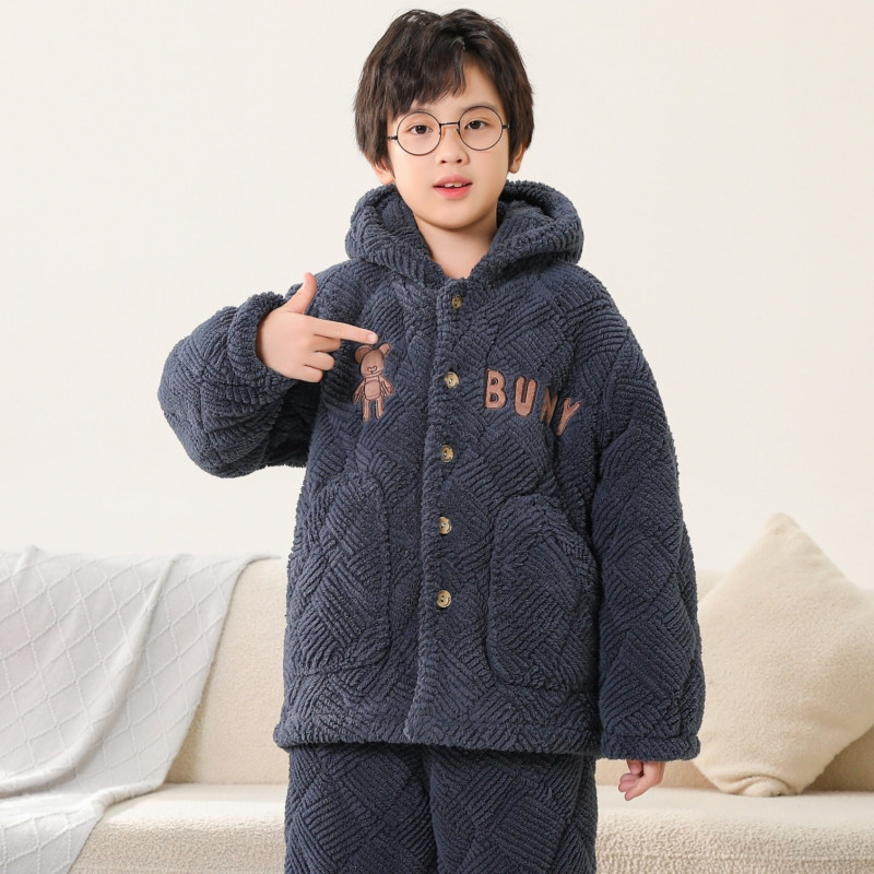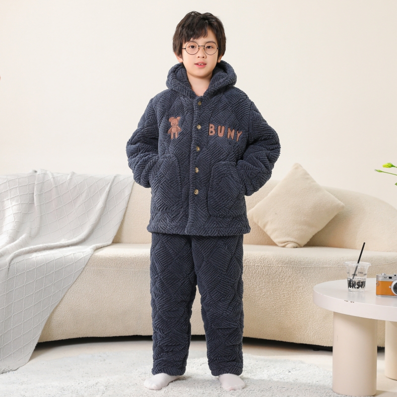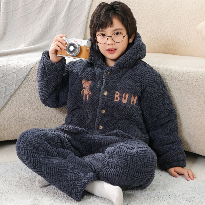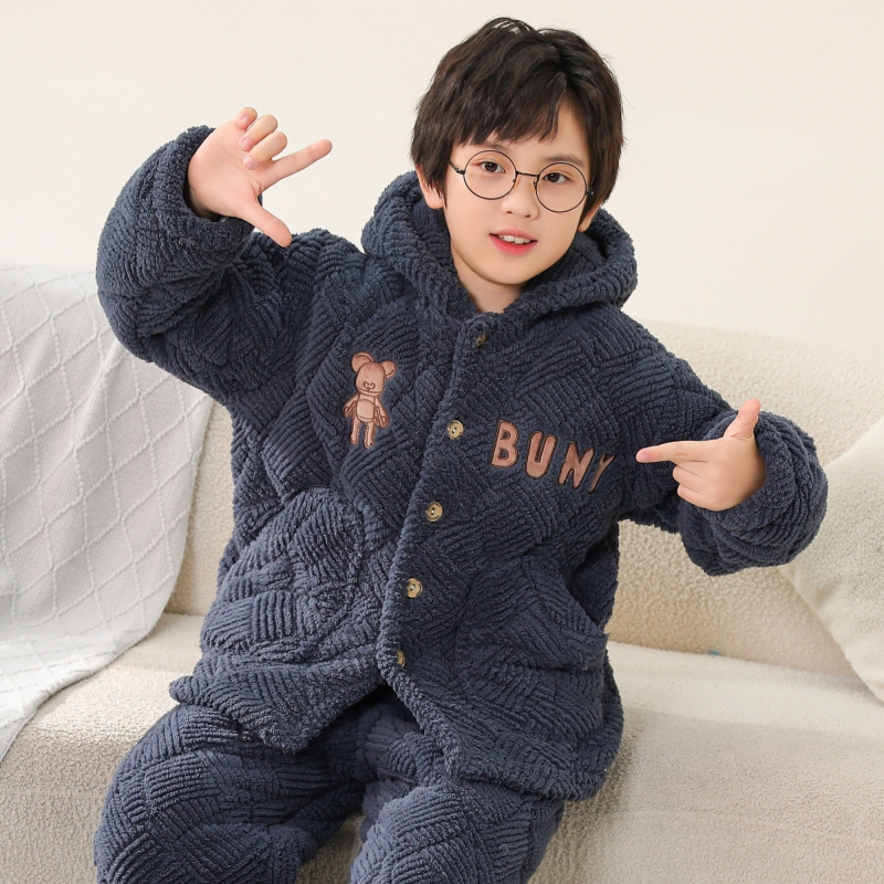 儿童睡衣冬季加厚款男童珊瑚绒中大童加绒保暖法兰绒三层夹棉带帽
