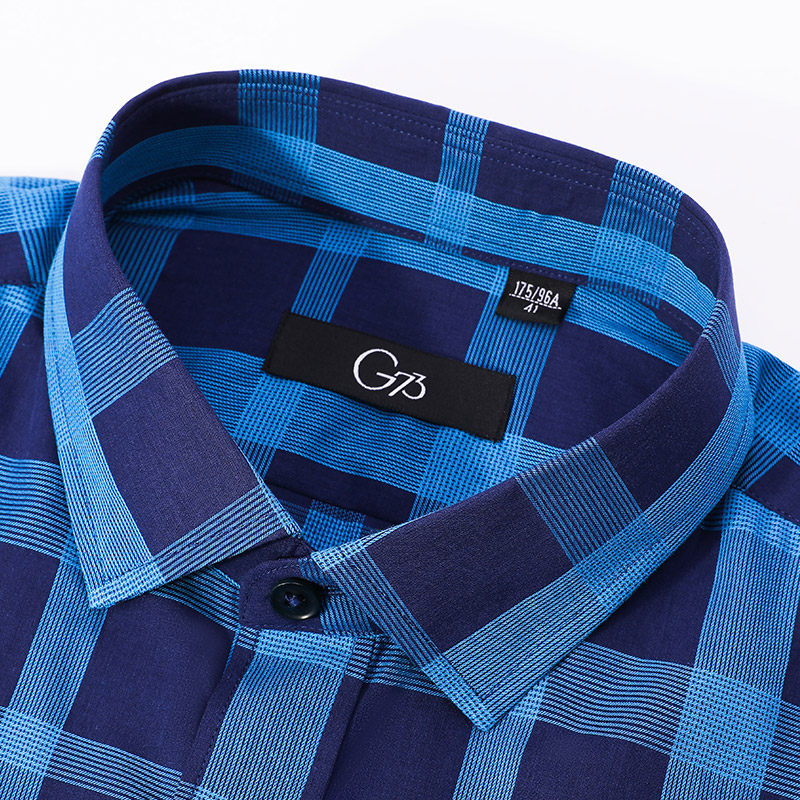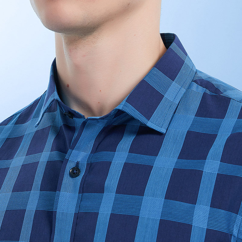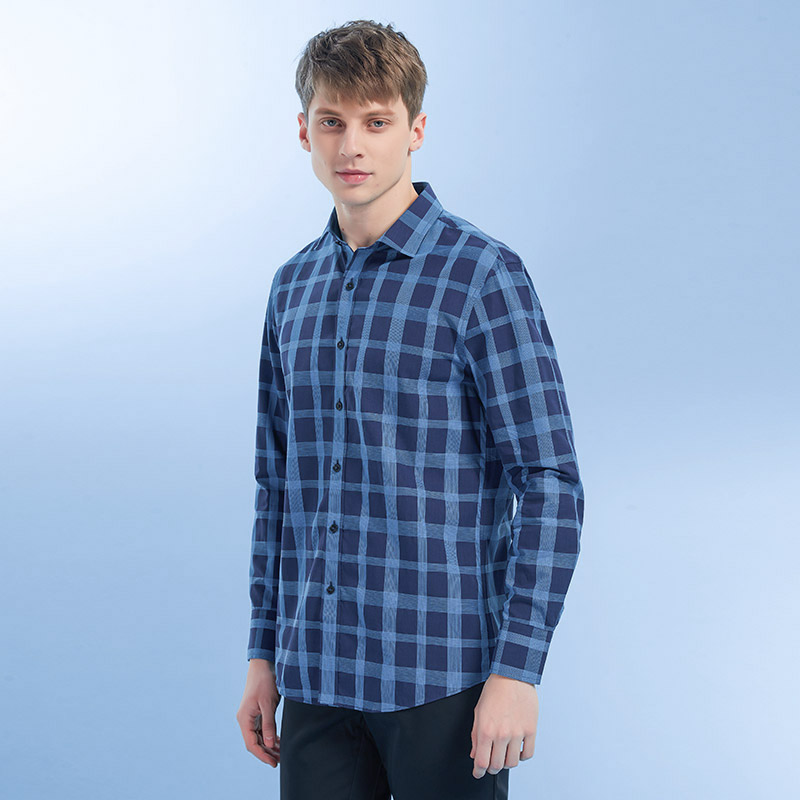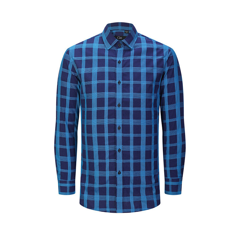 Giuseppe乔治白春夏男长袖衬衫方领蓝格子轻薄款休闲修身衬衣潮