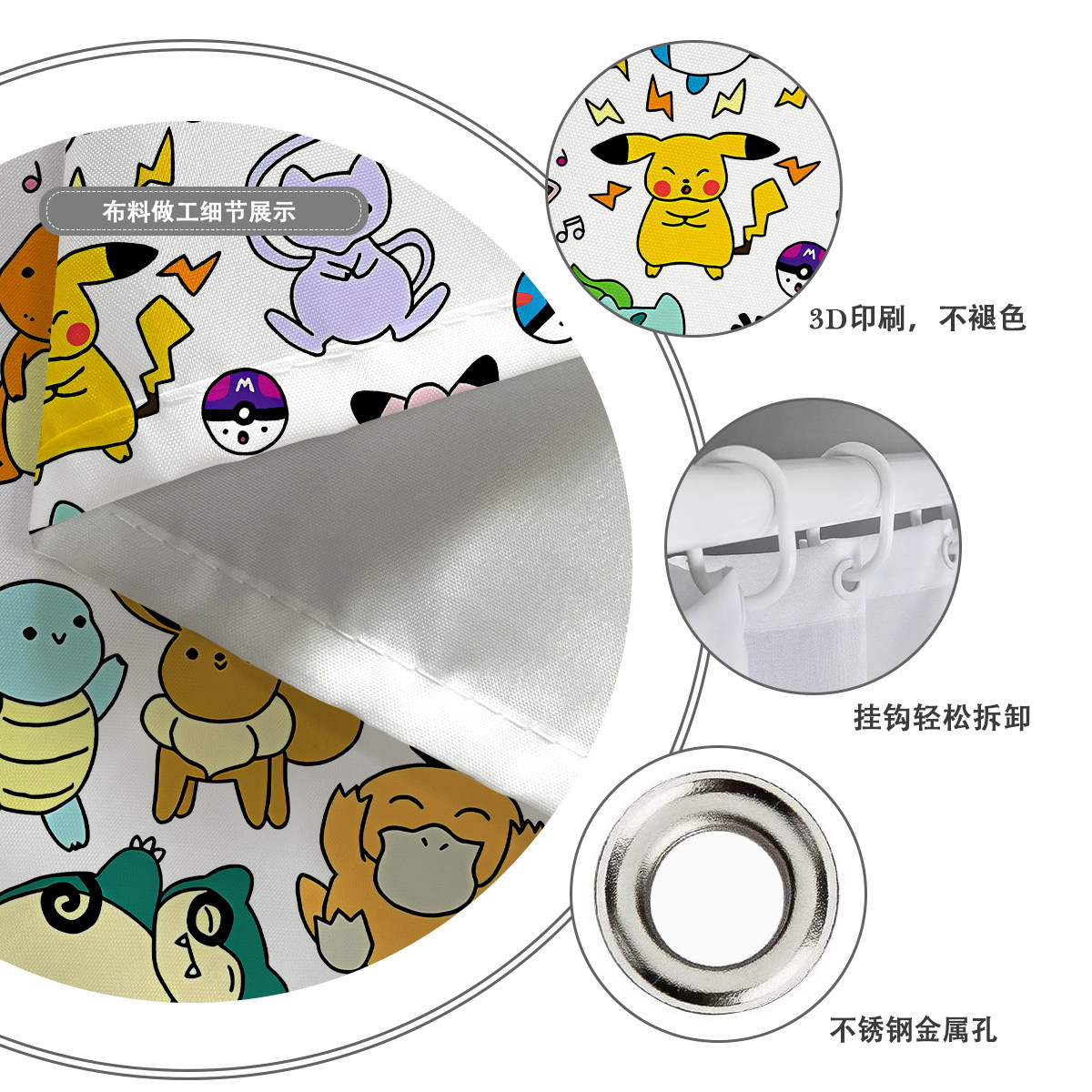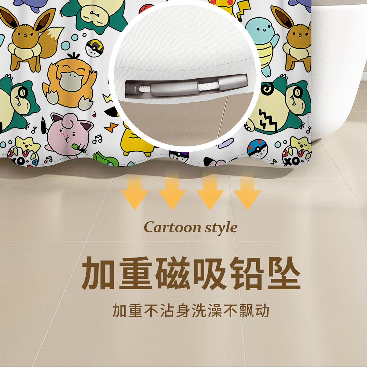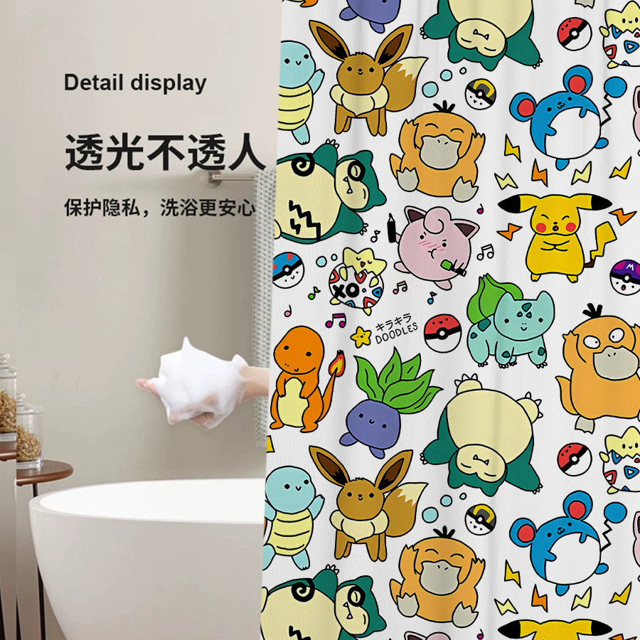 浴室免打孔防水布浴帘宝可梦可爱卡通洗澡卫生间隔断加厚涤纶挂帘