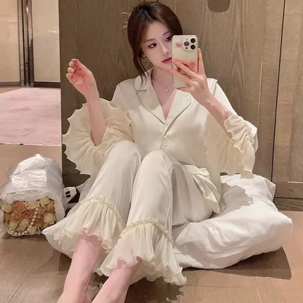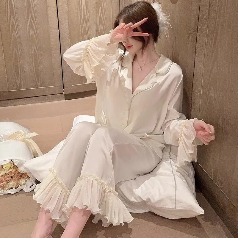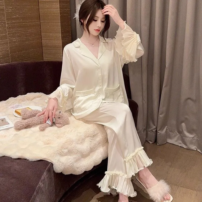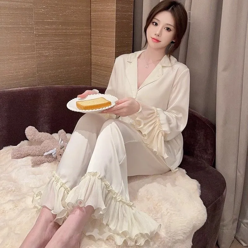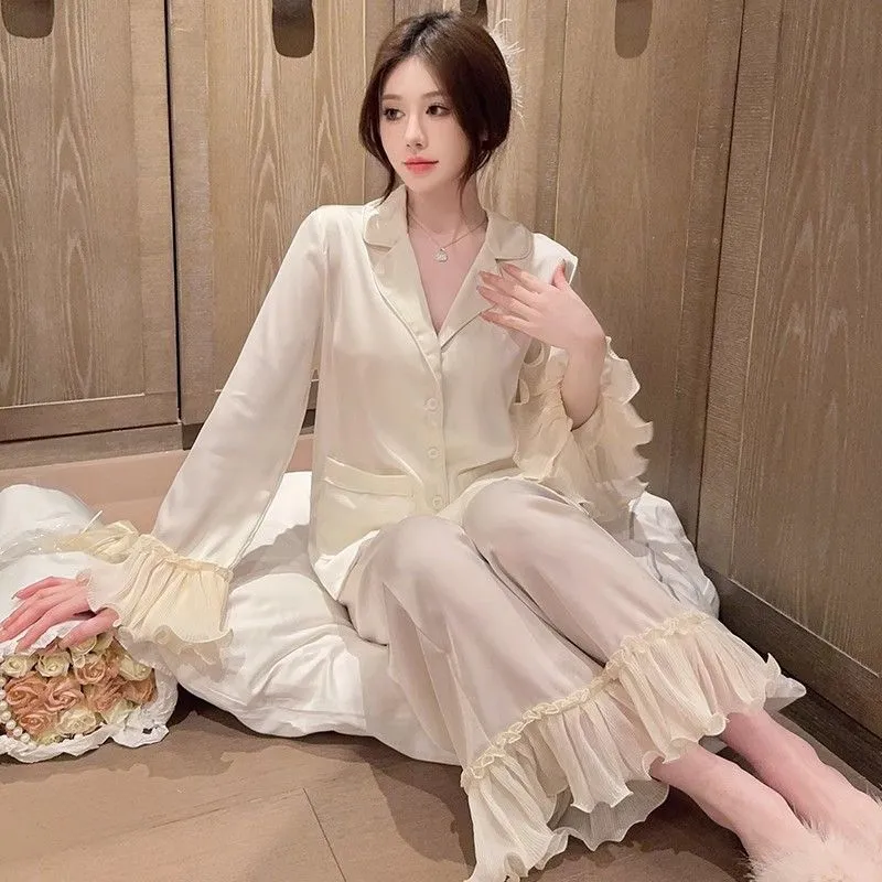 新款甜美睡衣女春秋季冰丝长袖长裤花边性感可外穿家居服套装