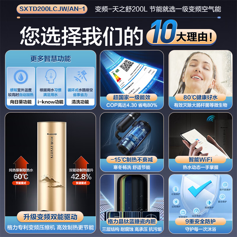 【政府补贴】格力空气能热水器家用一级能效200升L热泵变频天之舒