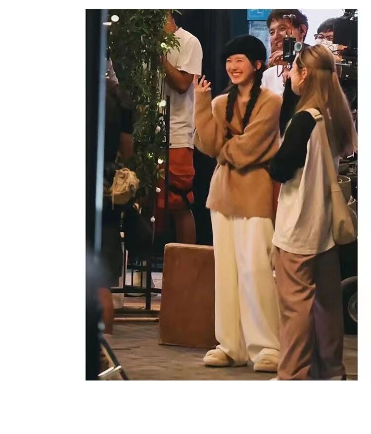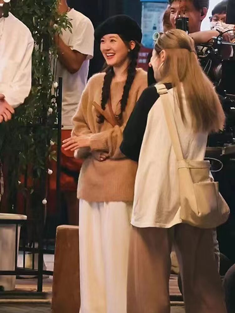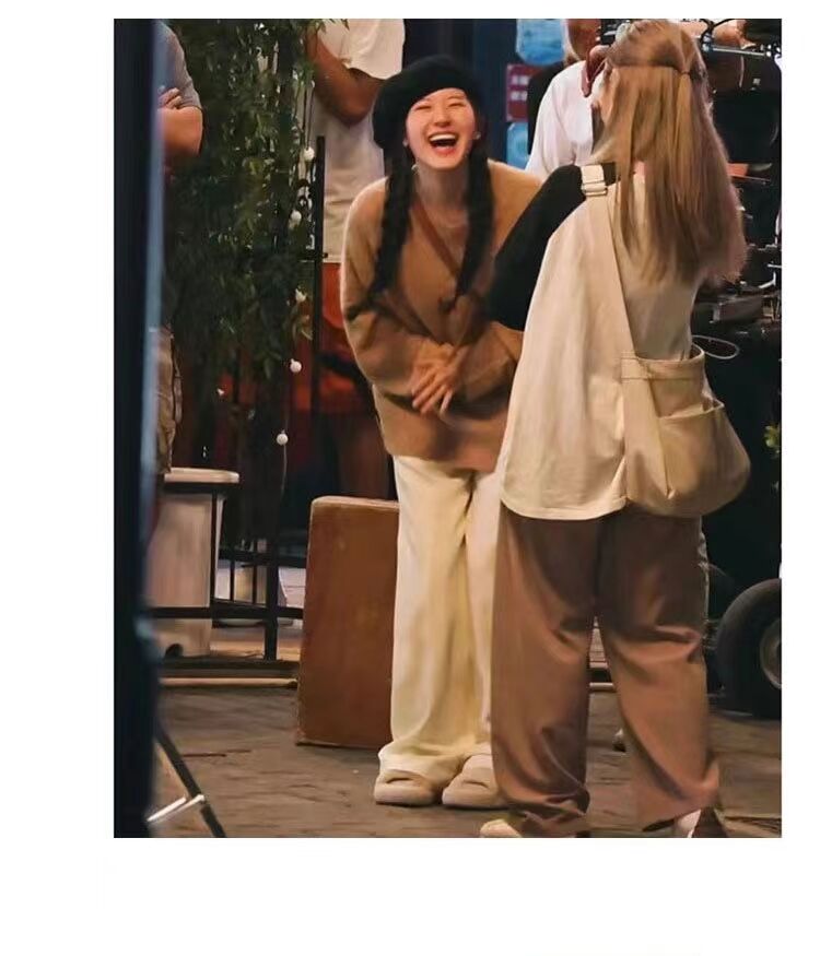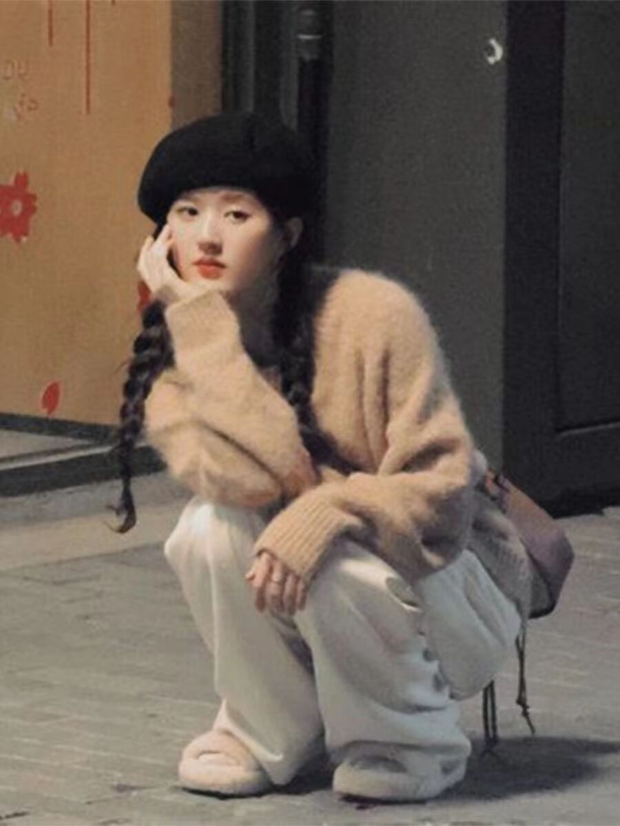 赵露思明星同款针织衫感驼色马海毛软糯套头毛衣休闲裤套装女