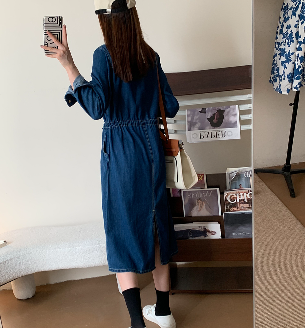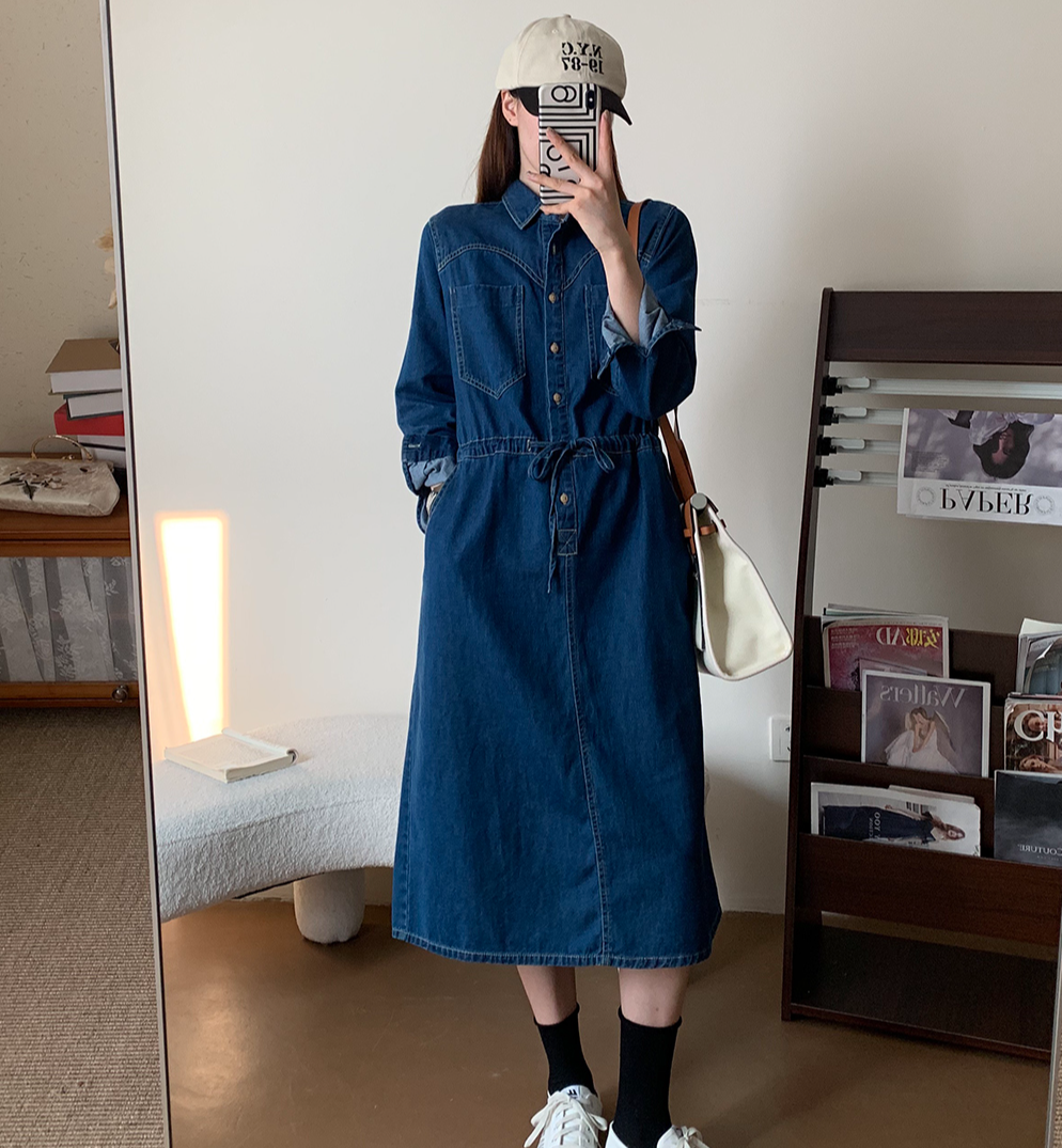高端!2025春新款全棉系带高腰显瘦百搭长袖牛仔裙连衣裙中长裙女