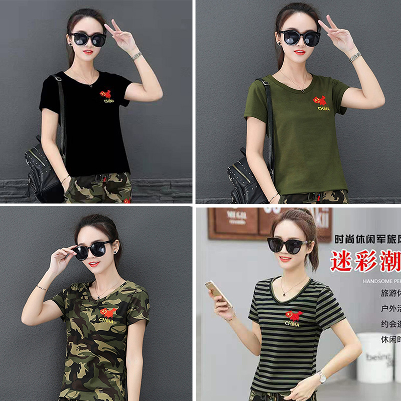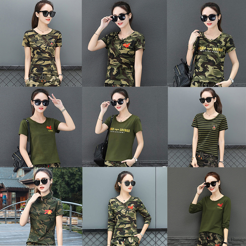夏季迷彩短袖女t恤秋季新款上衣广场舞黑色宽松显瘦半袖长袖圆领