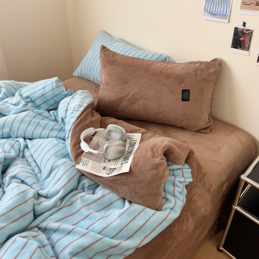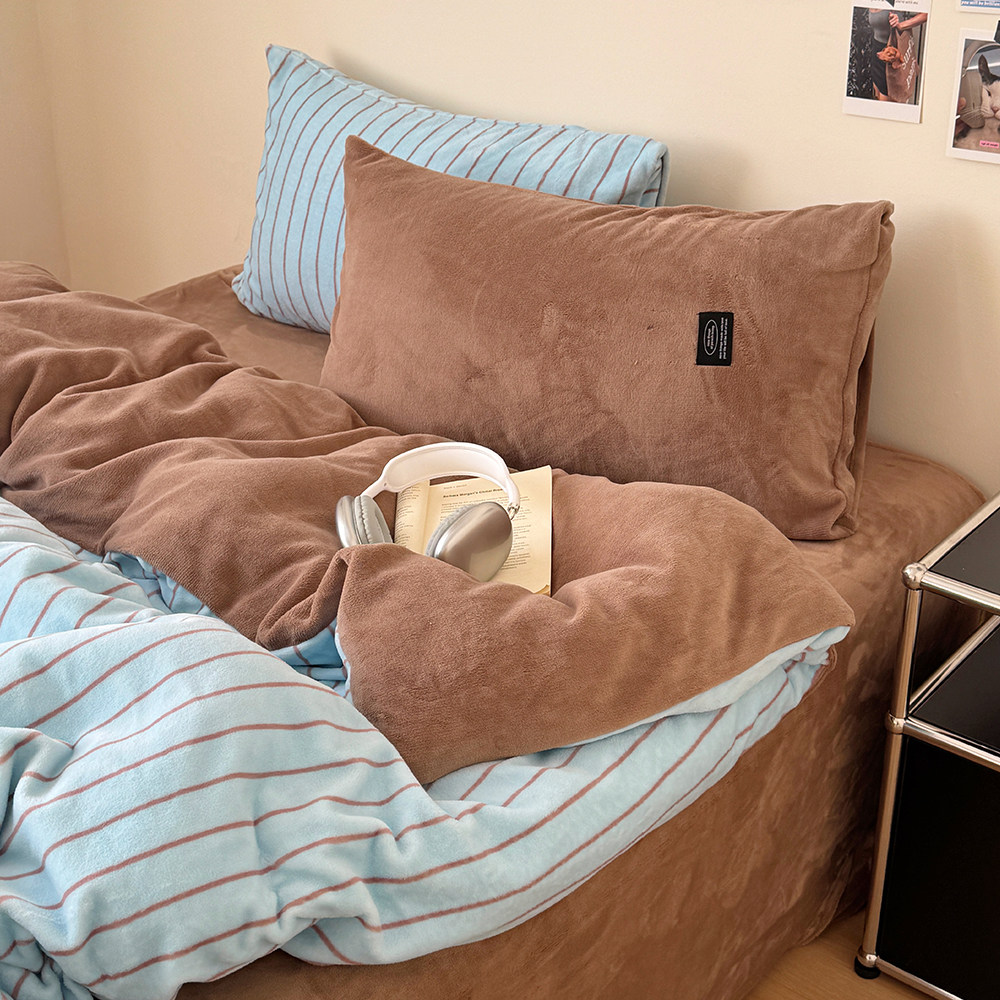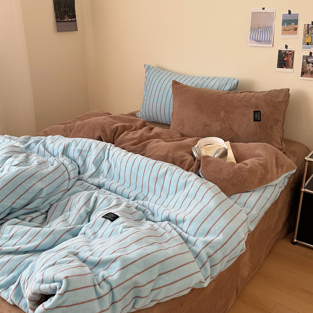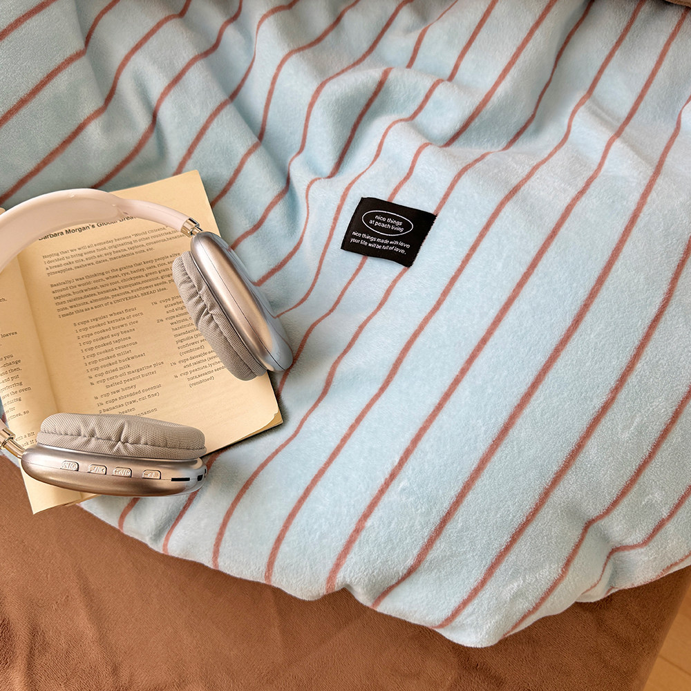 在耳边|复古条纹秋冬博主风慵懒加厚牛奶绒珊瑚绒保暖亲肤四件套