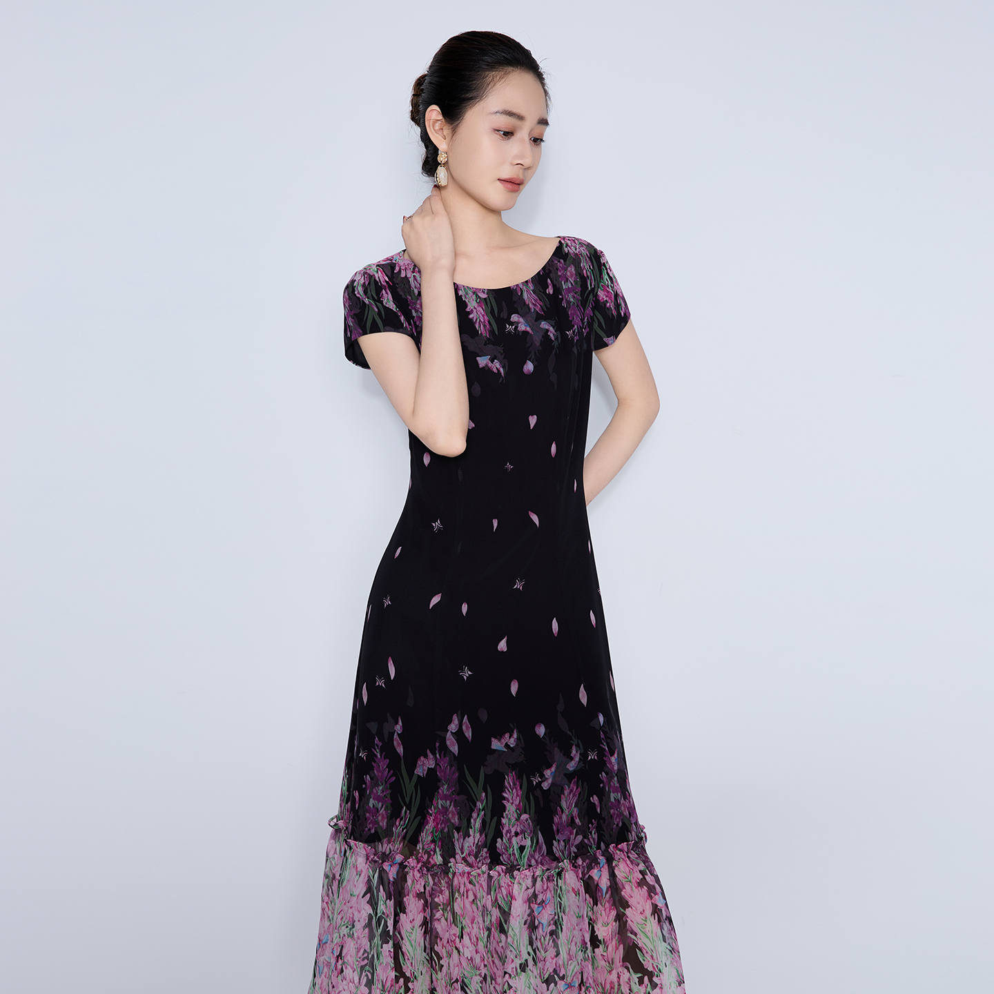 马天奴黑色印花雪纺收腰连衣裙