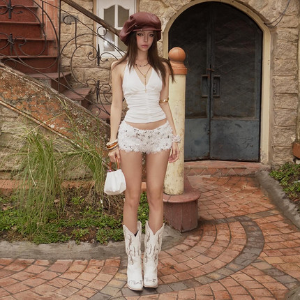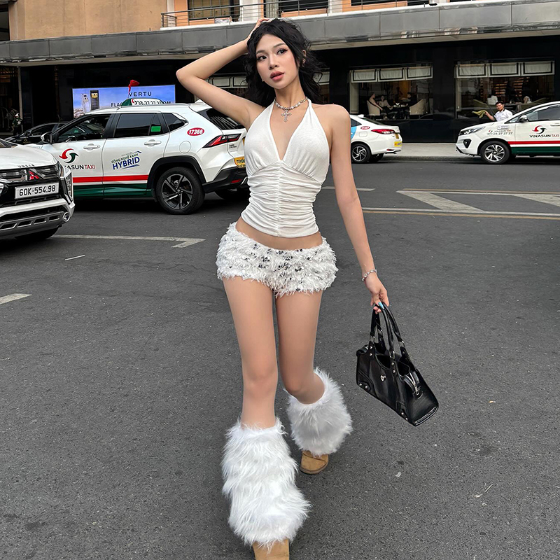 SylCue 拽辣性感褶皱显瘦V领挂脖吊带背心高腰毛毛短裤夏季两件套