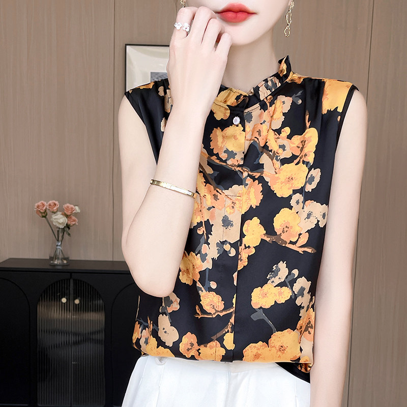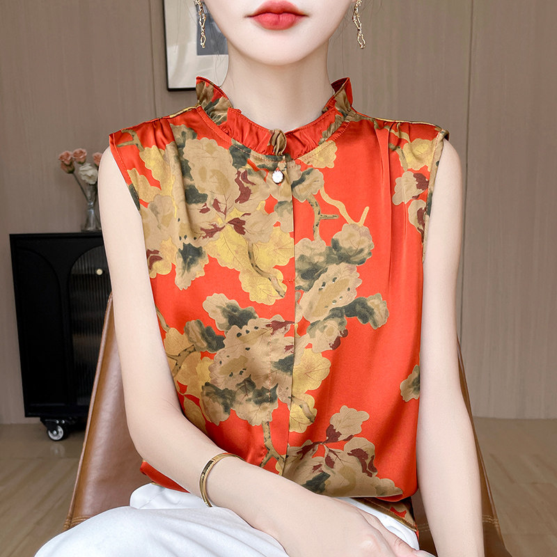 半高领无袖衬衫女木耳花边宽松显瘦高级缎面打底背心内搭减龄上衣