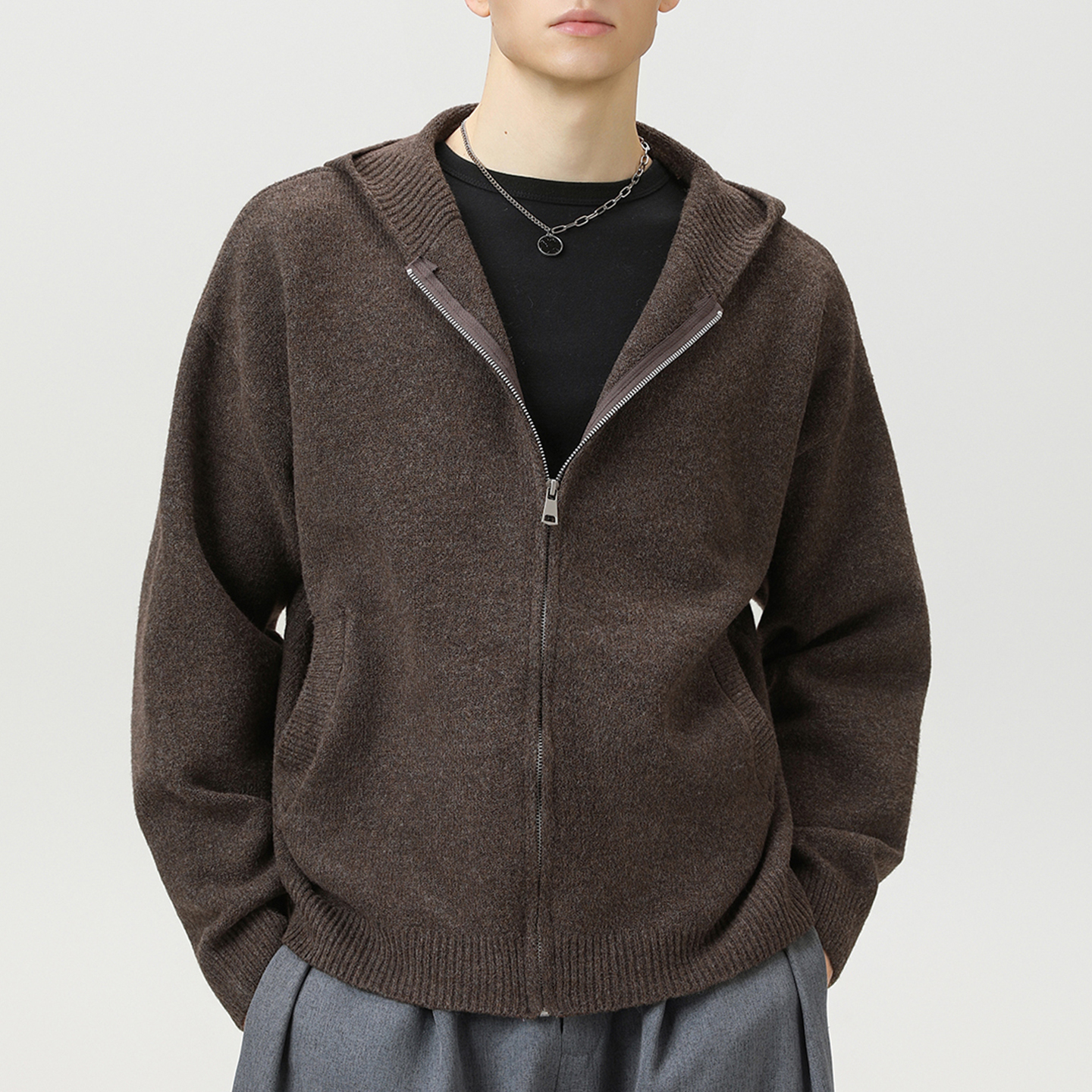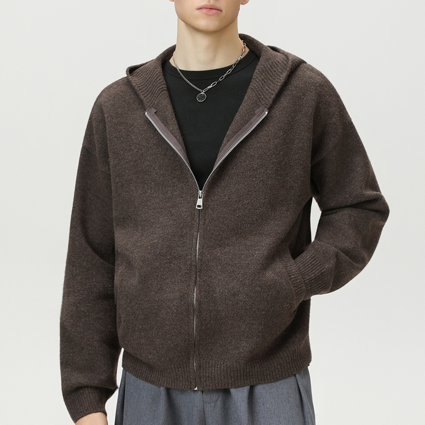男士纯色针织开衫外套男春秋款2025新款连帽拉链毛衣棕色百搭上衣