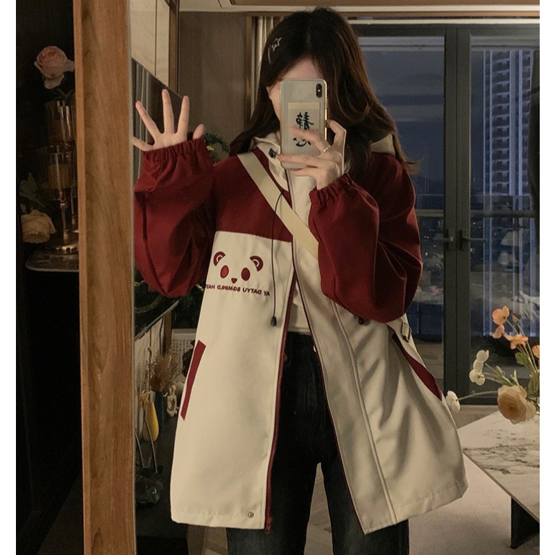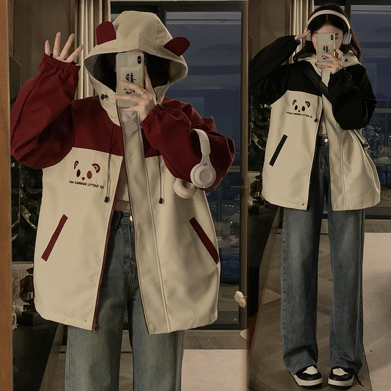 学院风可爱熊猫冲锋衣女春秋2024新款甜美小个子宽松休闲连帽外套