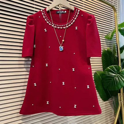 加大码女装欧洲站洋气短袖上衣胖妹妹百搭显瘦钉珠烫钻半袖T恤衫