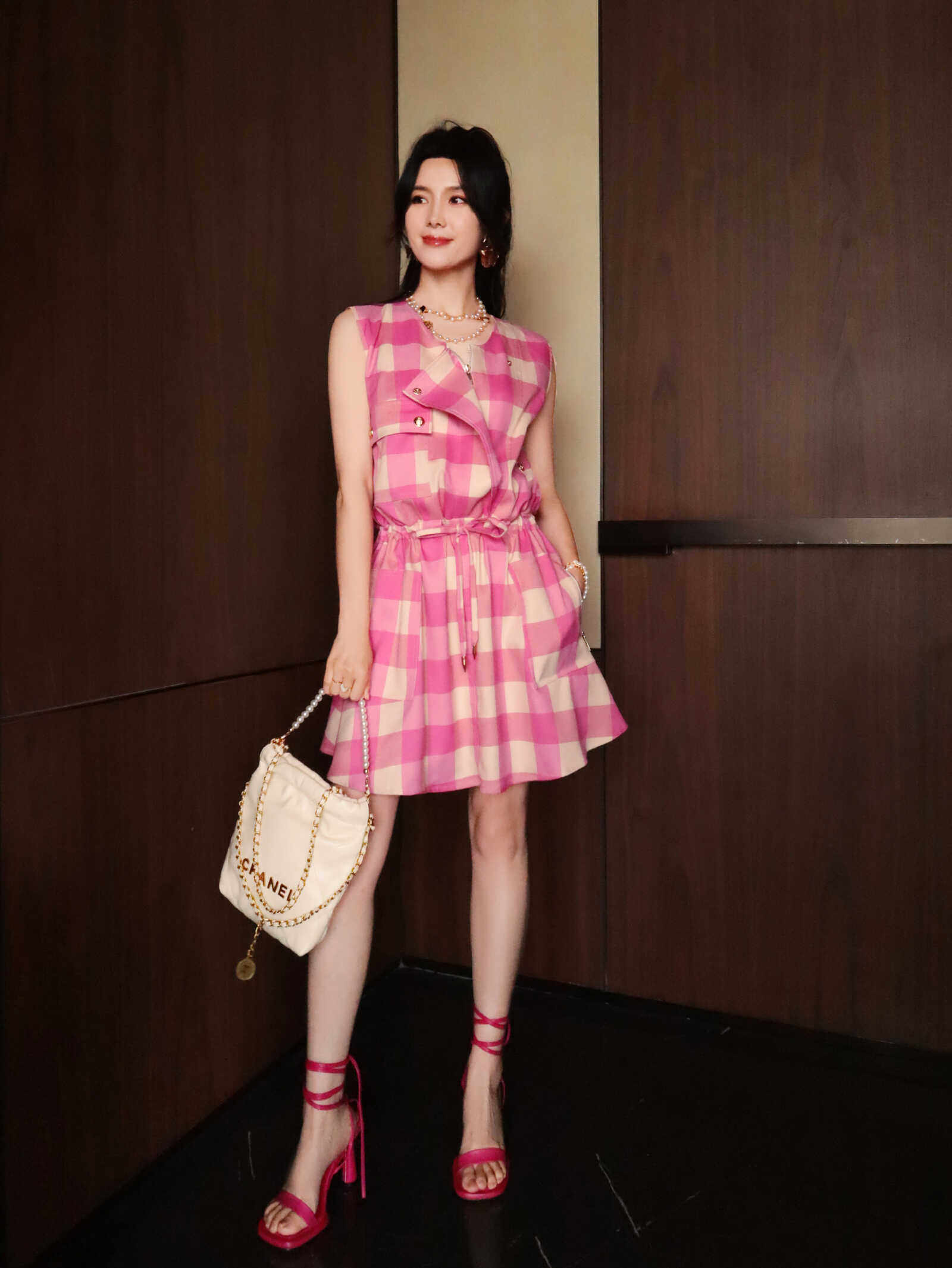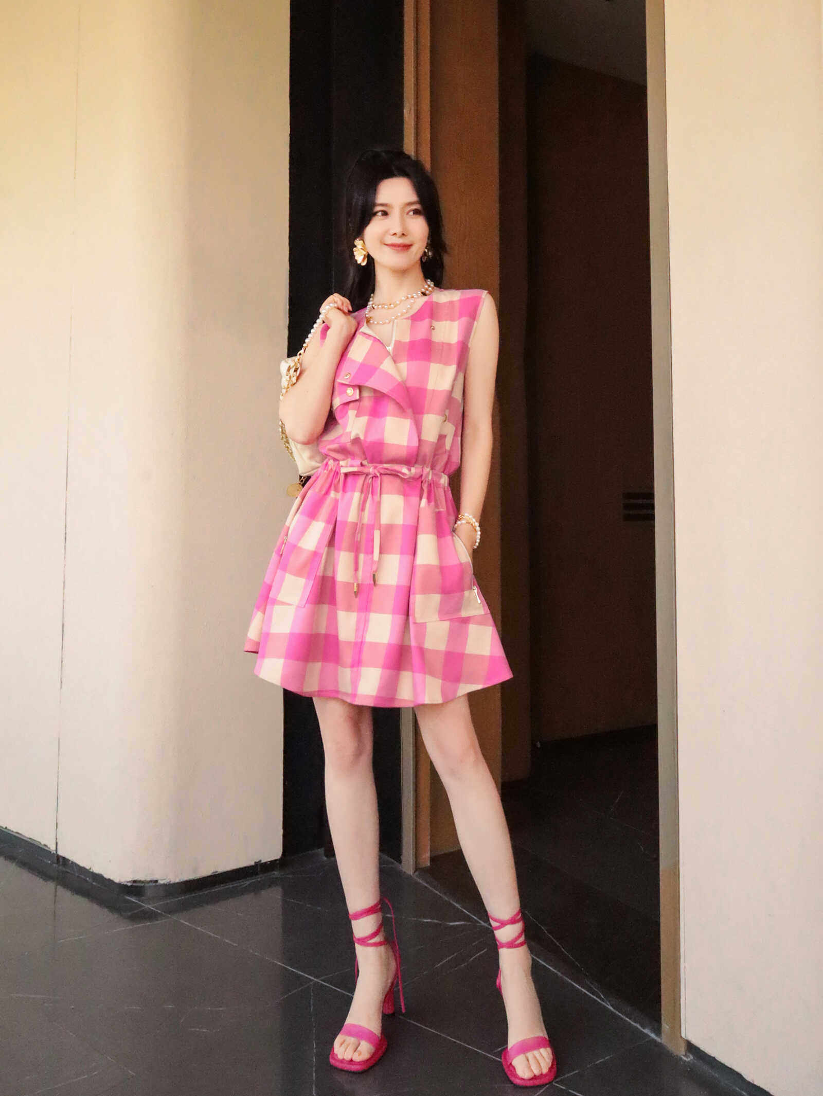 夏日玫红格纹设计感无袖连衣裙女