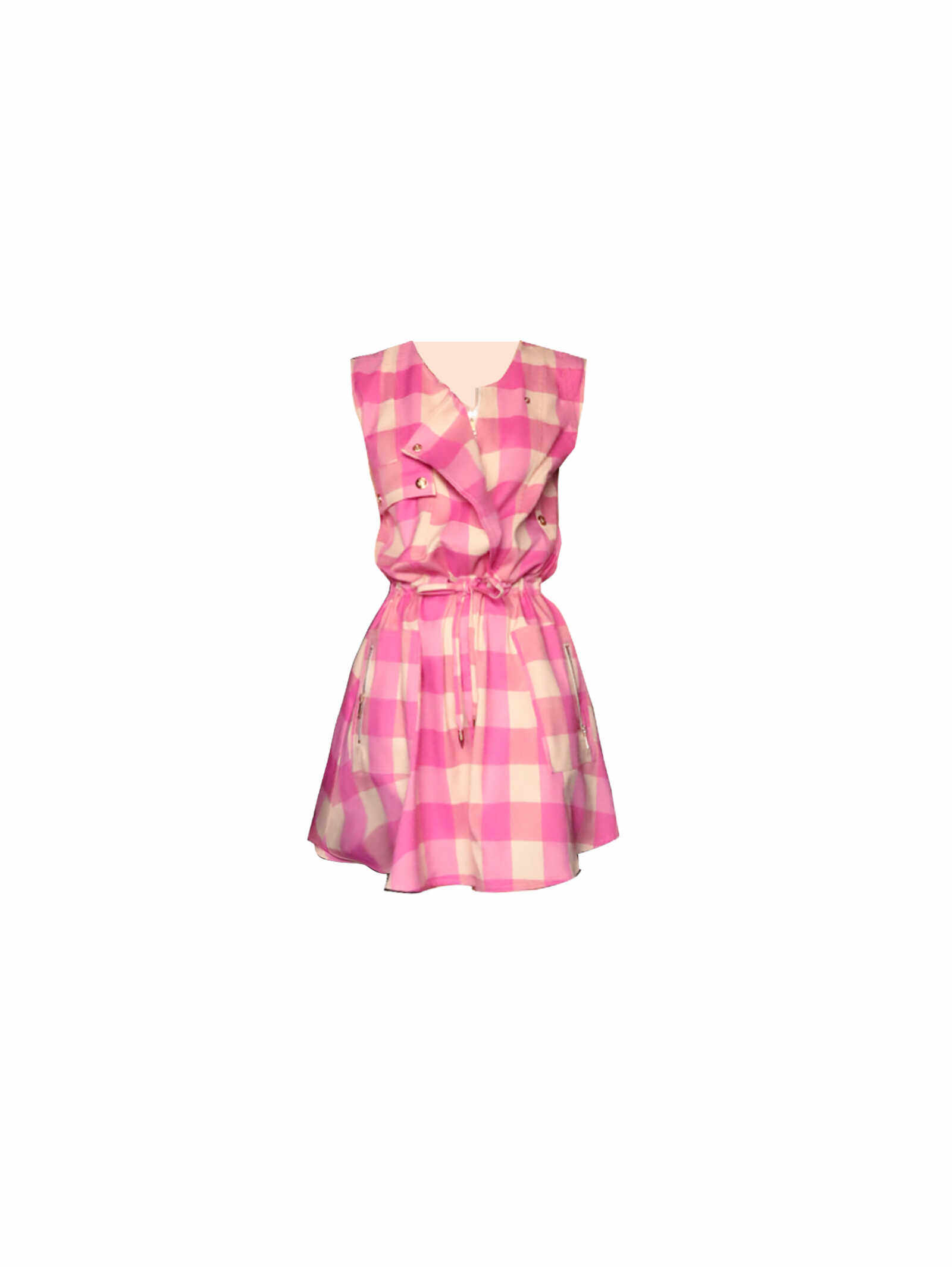 设计感格纹新款时髦高级甜辣无袖工装宽松圆领抽绳A字连衣裙女夏