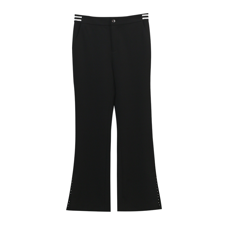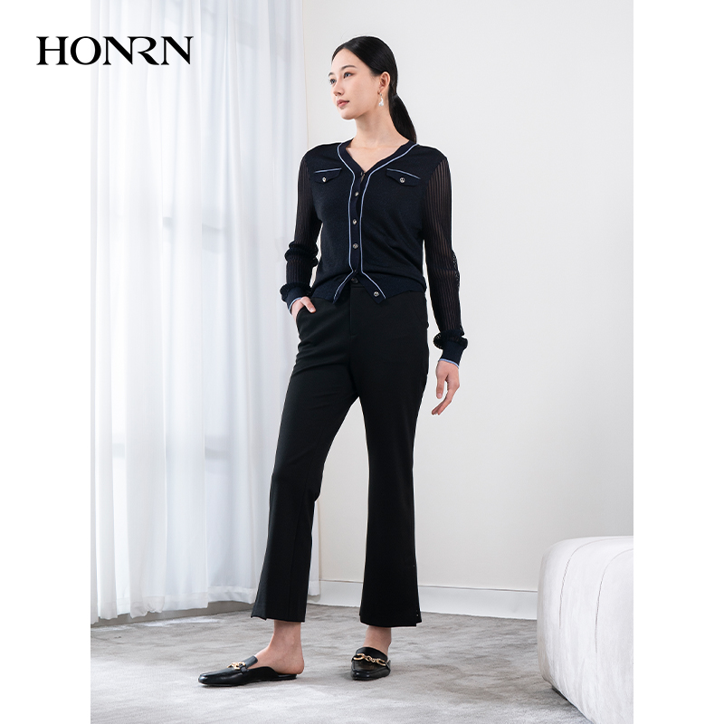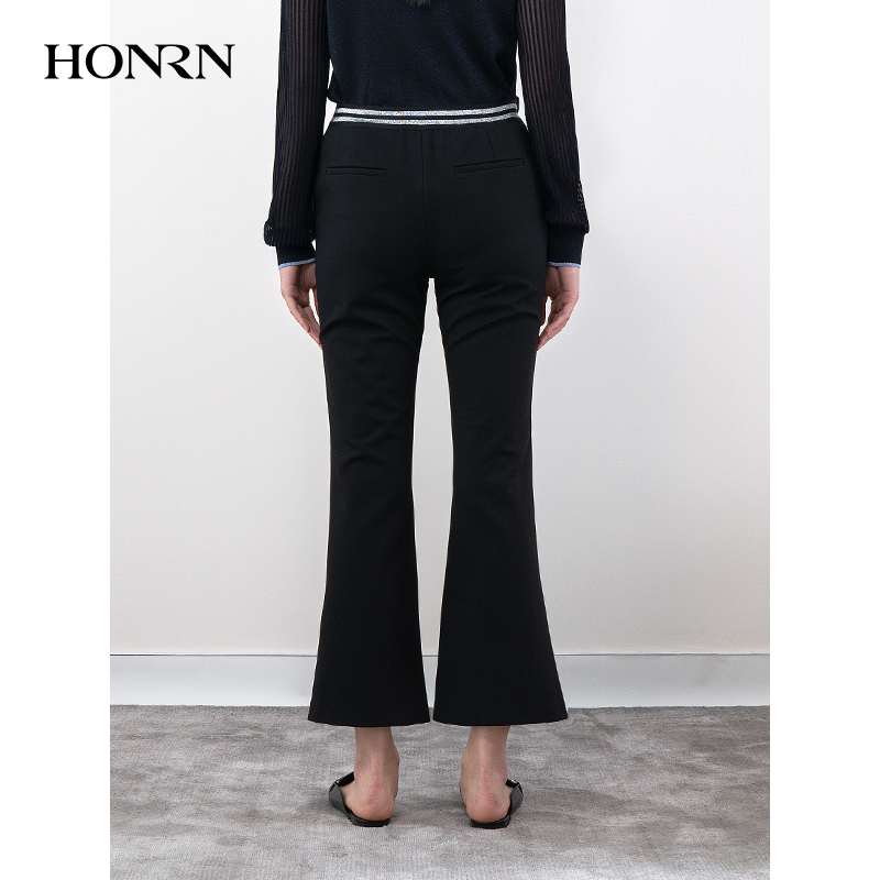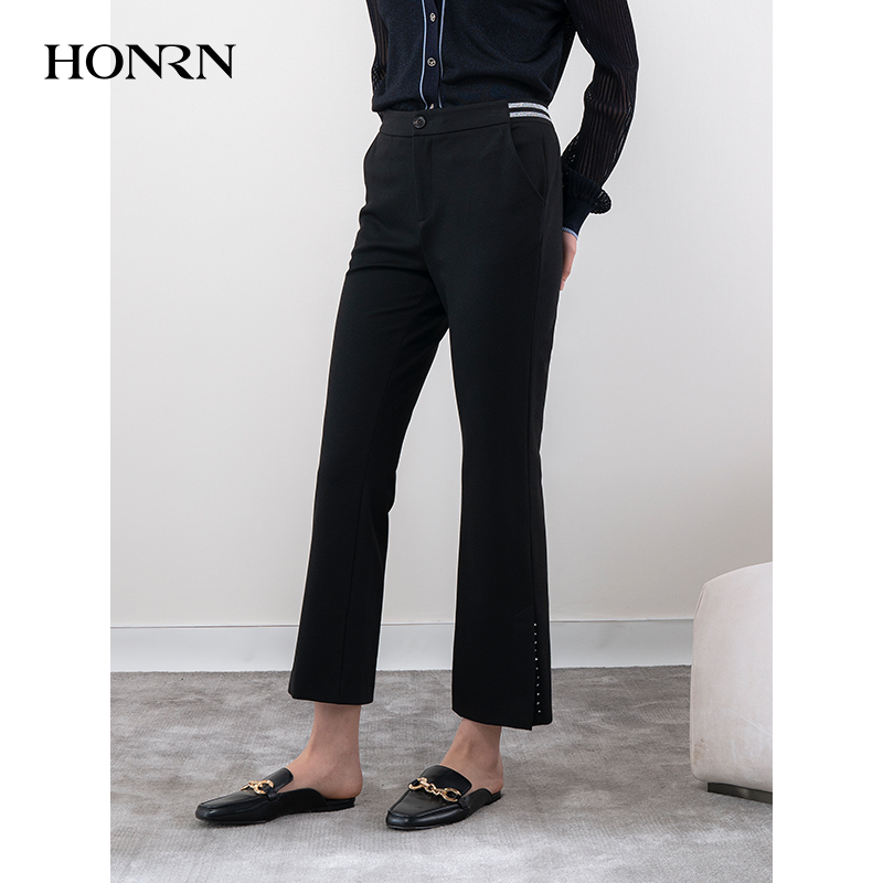 HONRN/红人黑色裤子修身垂感直筒九分微喇休闲裤女春秋HH11OK812