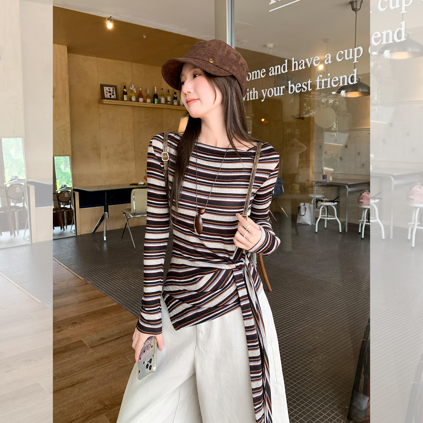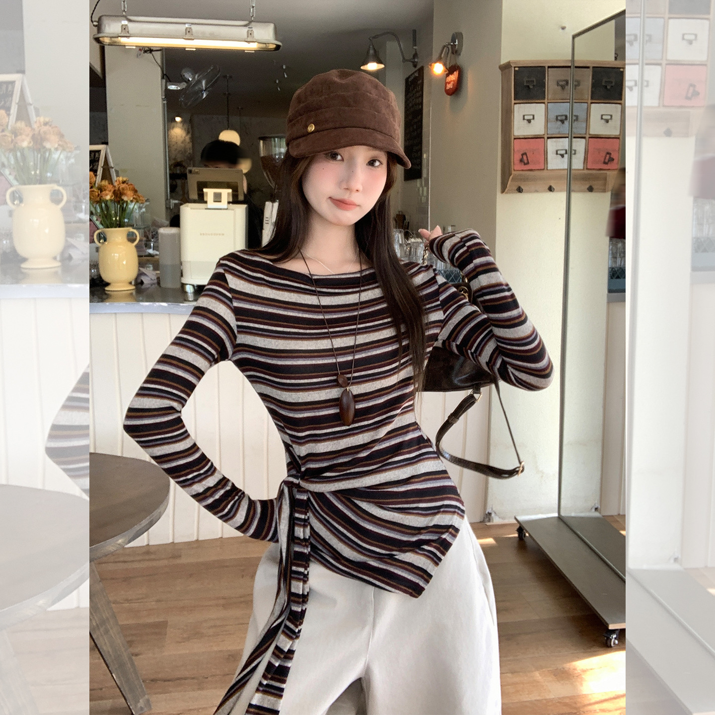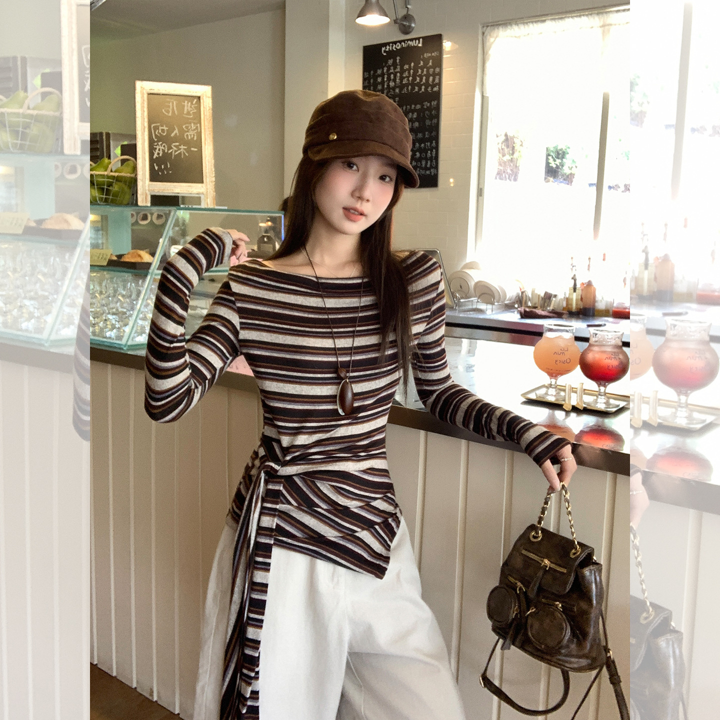 一字领条纹绑带拼接长袖T恤女秋季新款收腰显瘦露肩内搭打底上衣