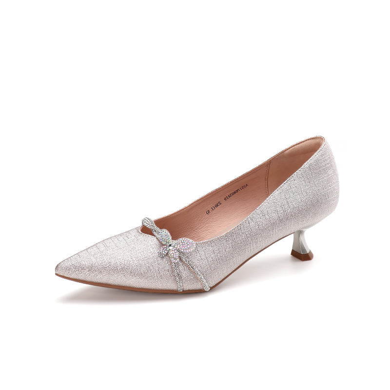 千百度2025静音鞋尖头细跟羊皮蝴蝶钻饰婚鞋单鞋A25176803A01A19