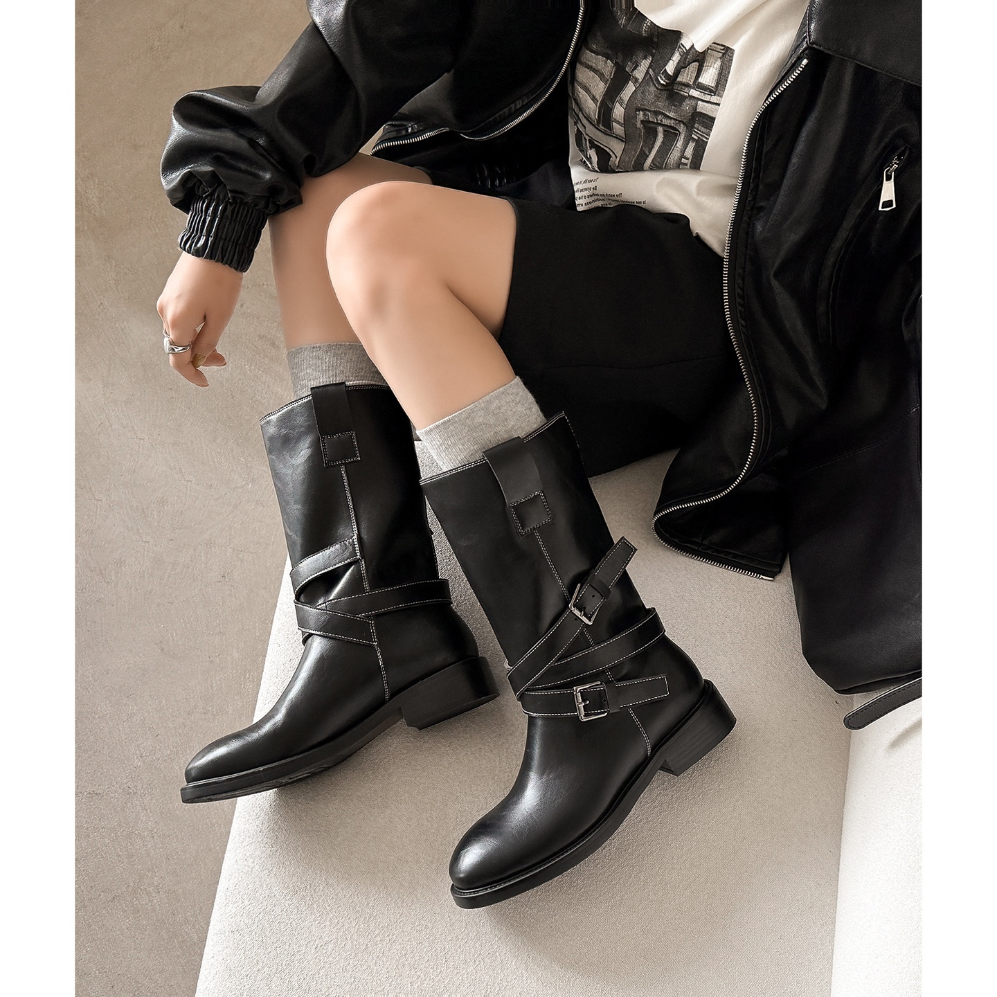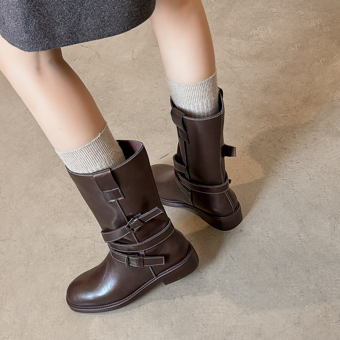 一力米灰2025年新款女靴子粗跟皮带扣舒适中筒靴子女靴子中筒靴子