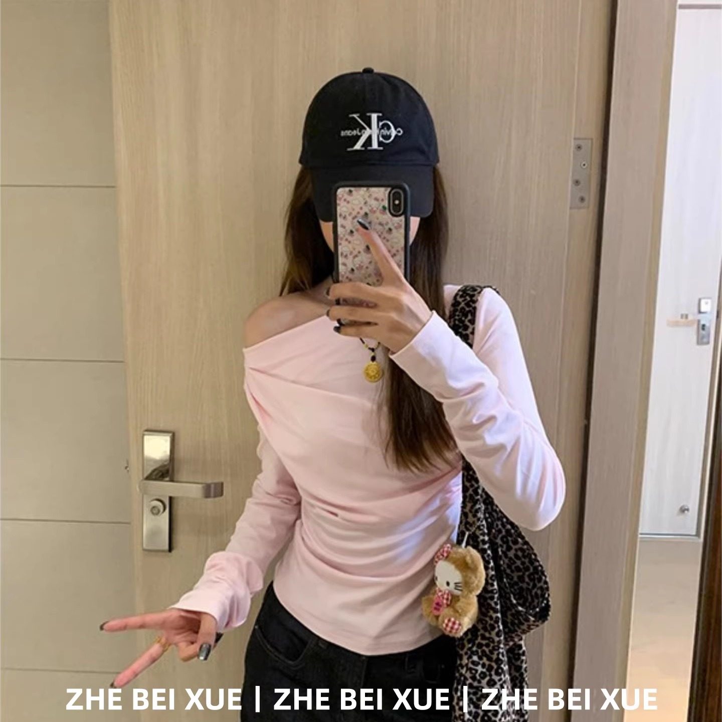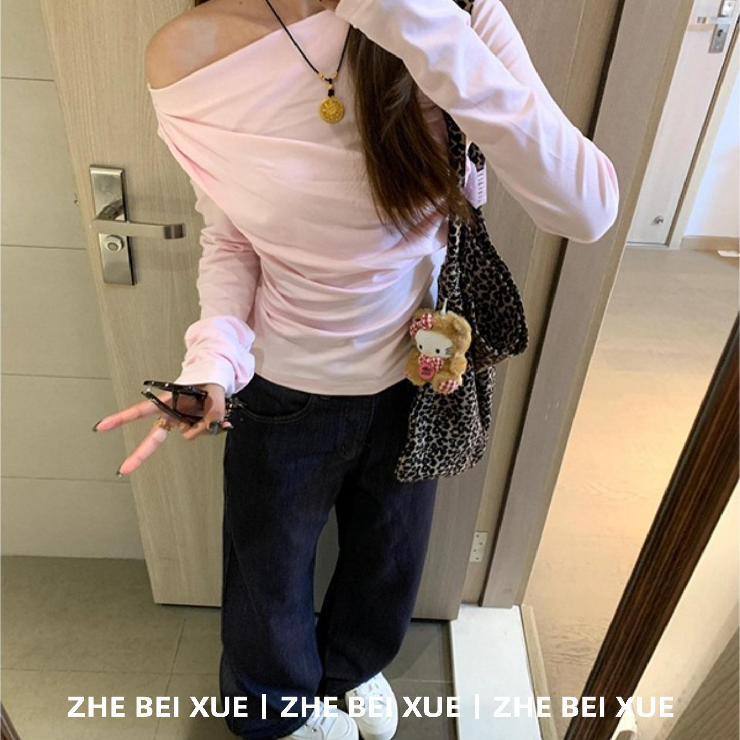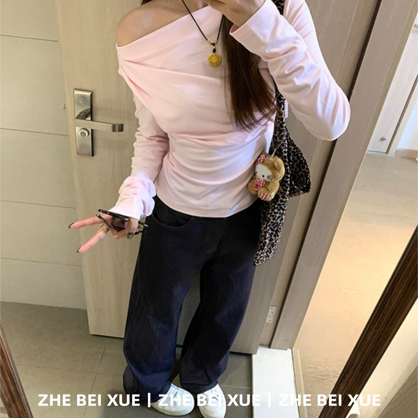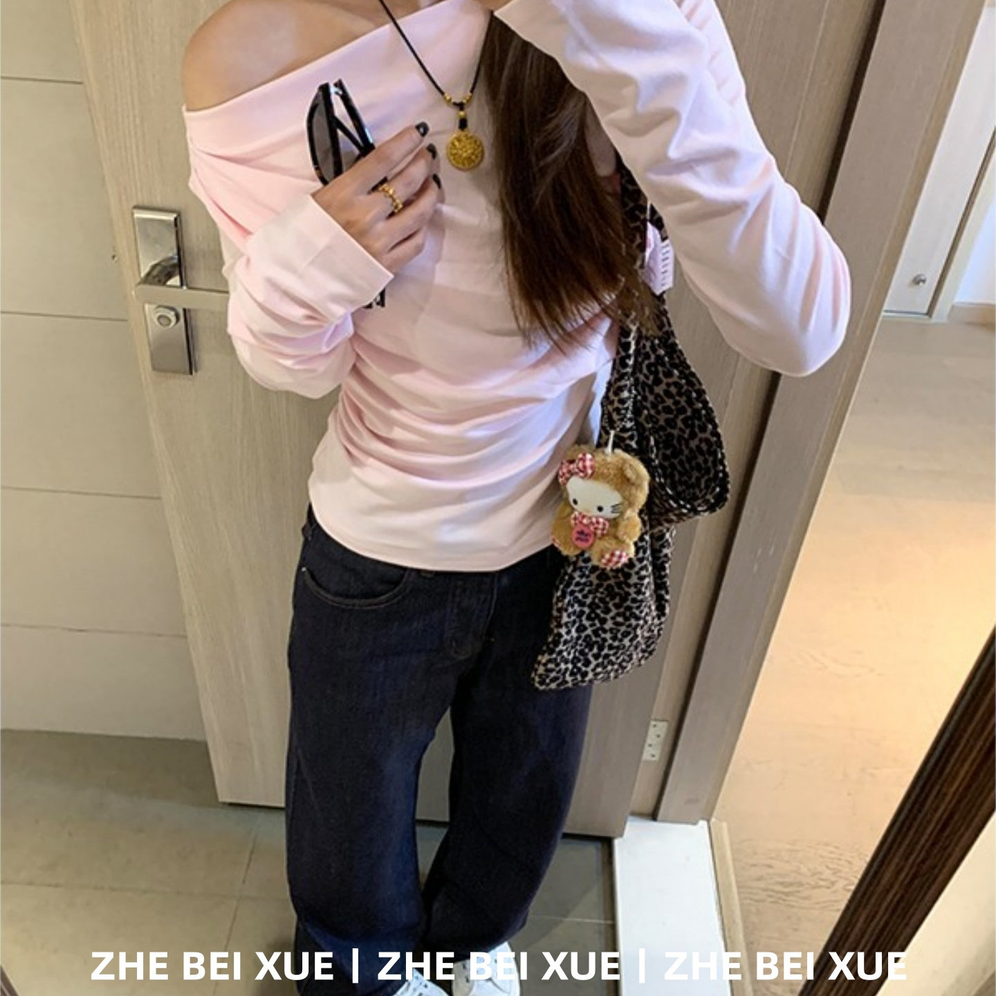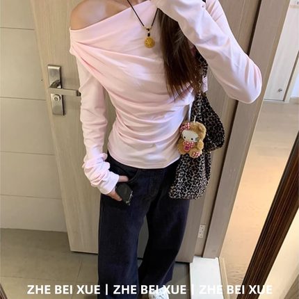 套装女韩系斜露肩粉色长袖上衣休闲直筒牛仔裤独特漂亮冬装一整套