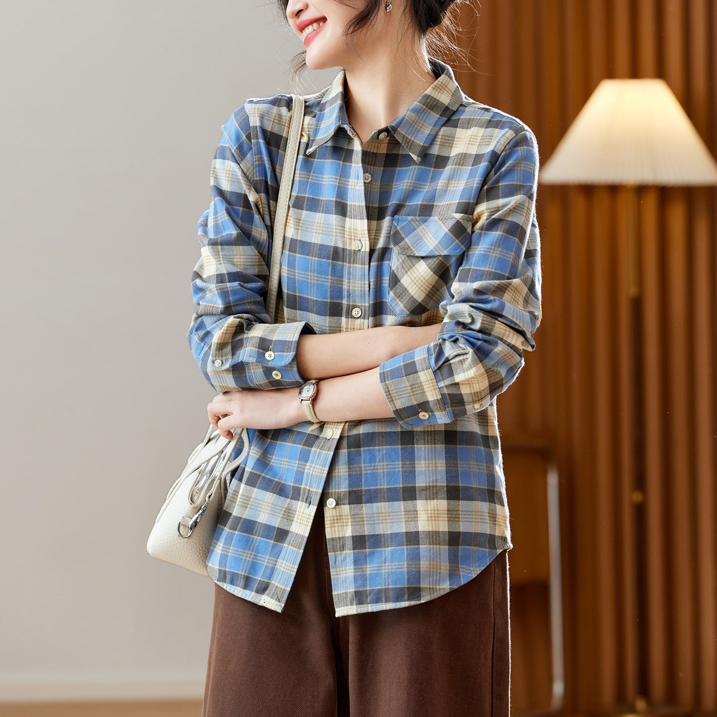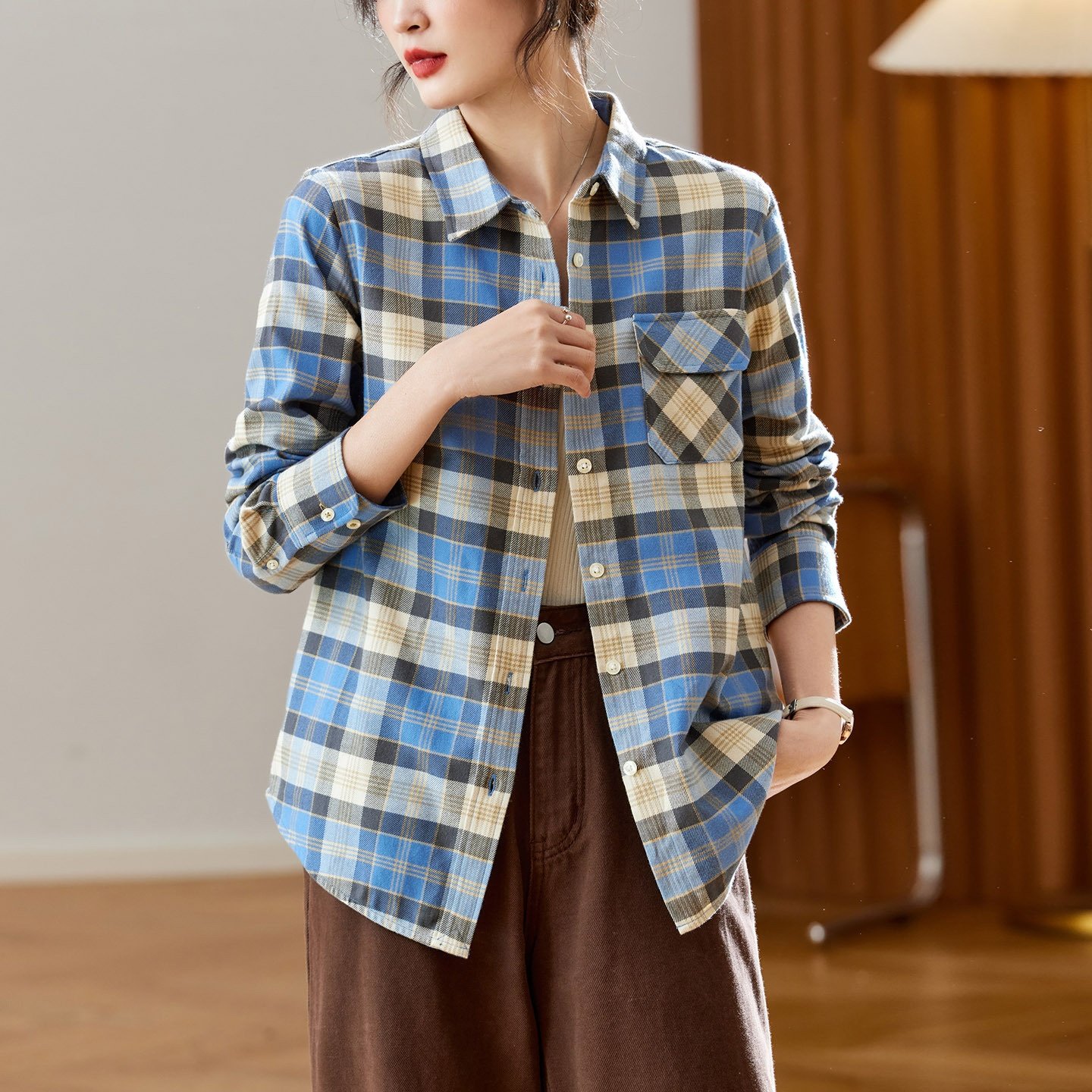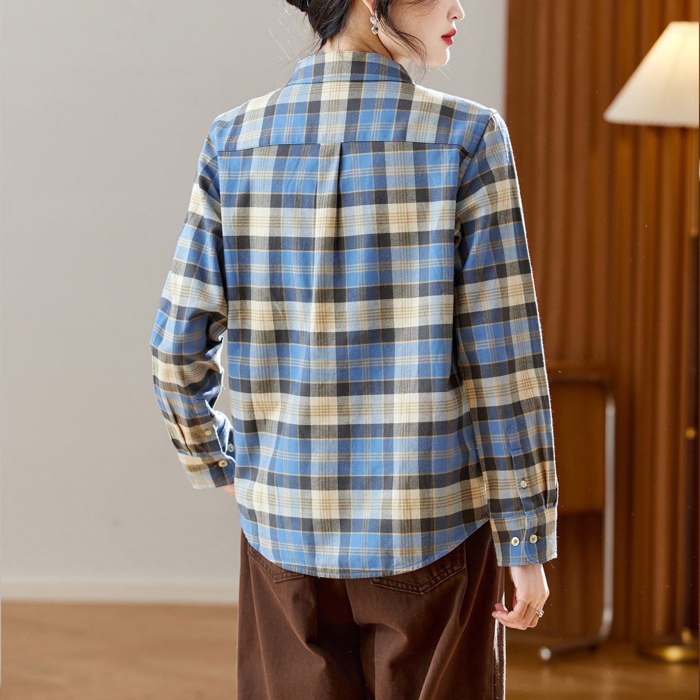2025新款棉茧 磨毛加厚格子蓝格子衬衫女长袖2025秋冬装新款文艺