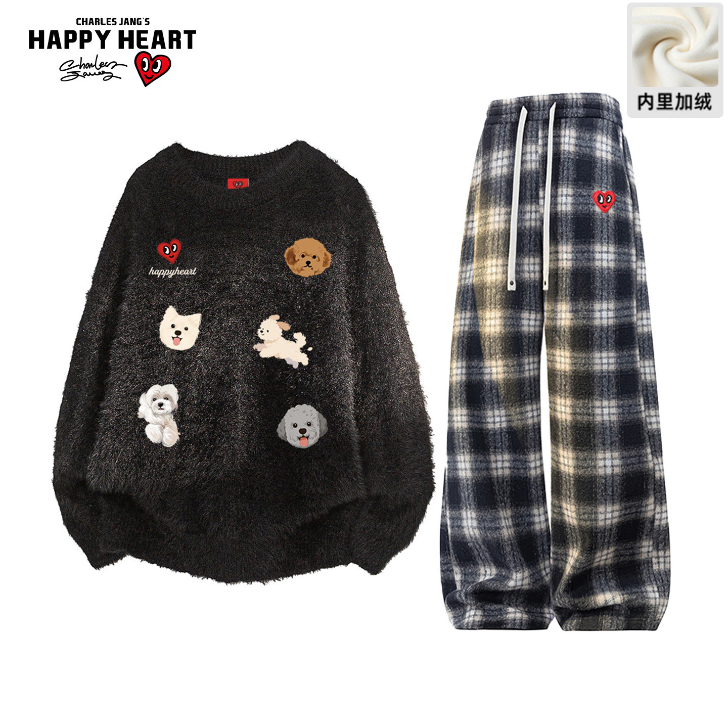查尔斯桃心休闲套装男女冬季水貂绒圆领毛衣小香风长裤子两件装潮