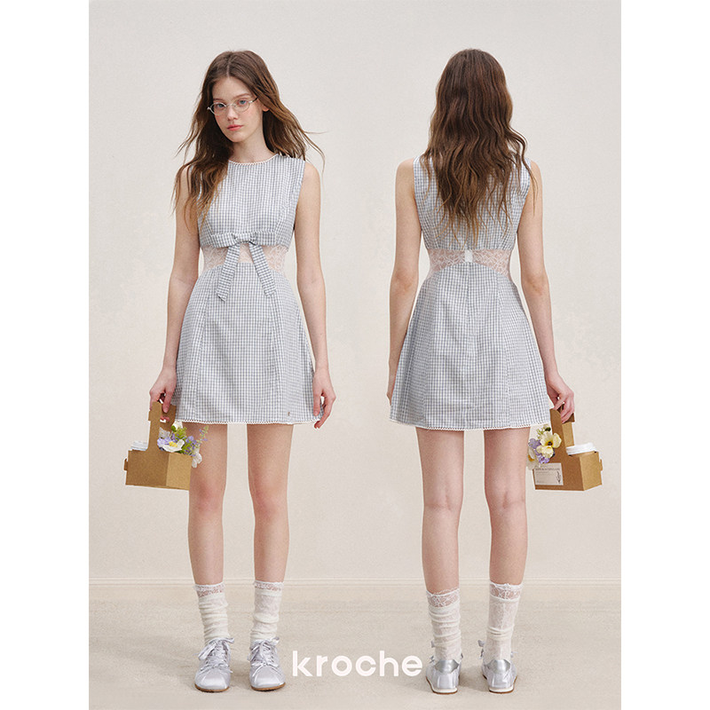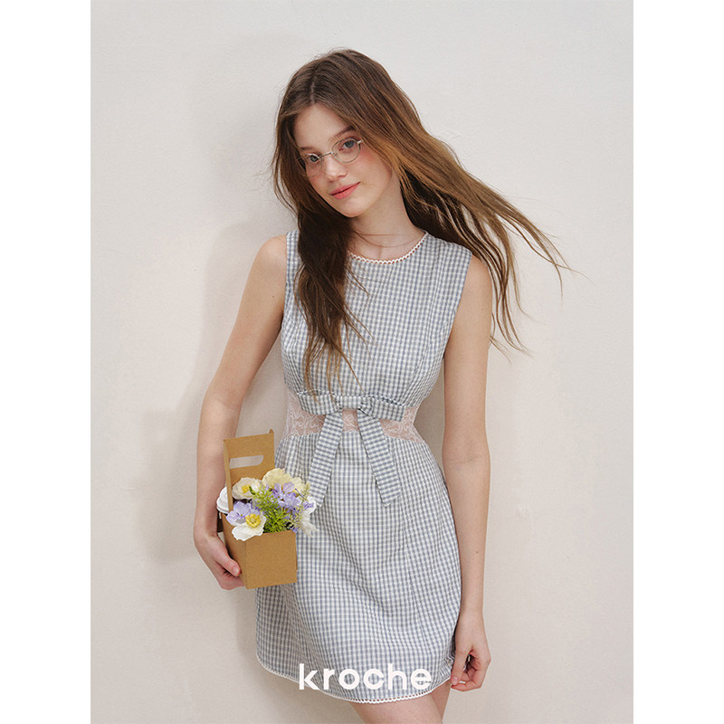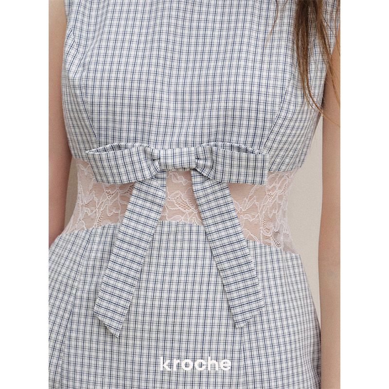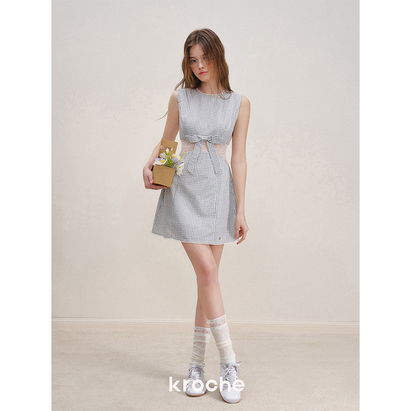 Kroche 浪漫格调 蕾丝拼接 蝴蝶结棉感格纹收腰无袖连衣裙