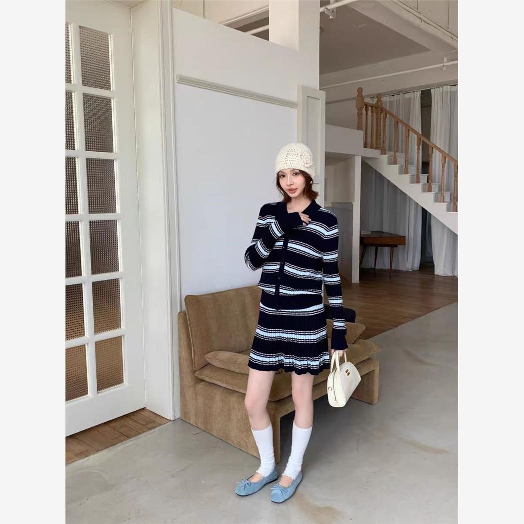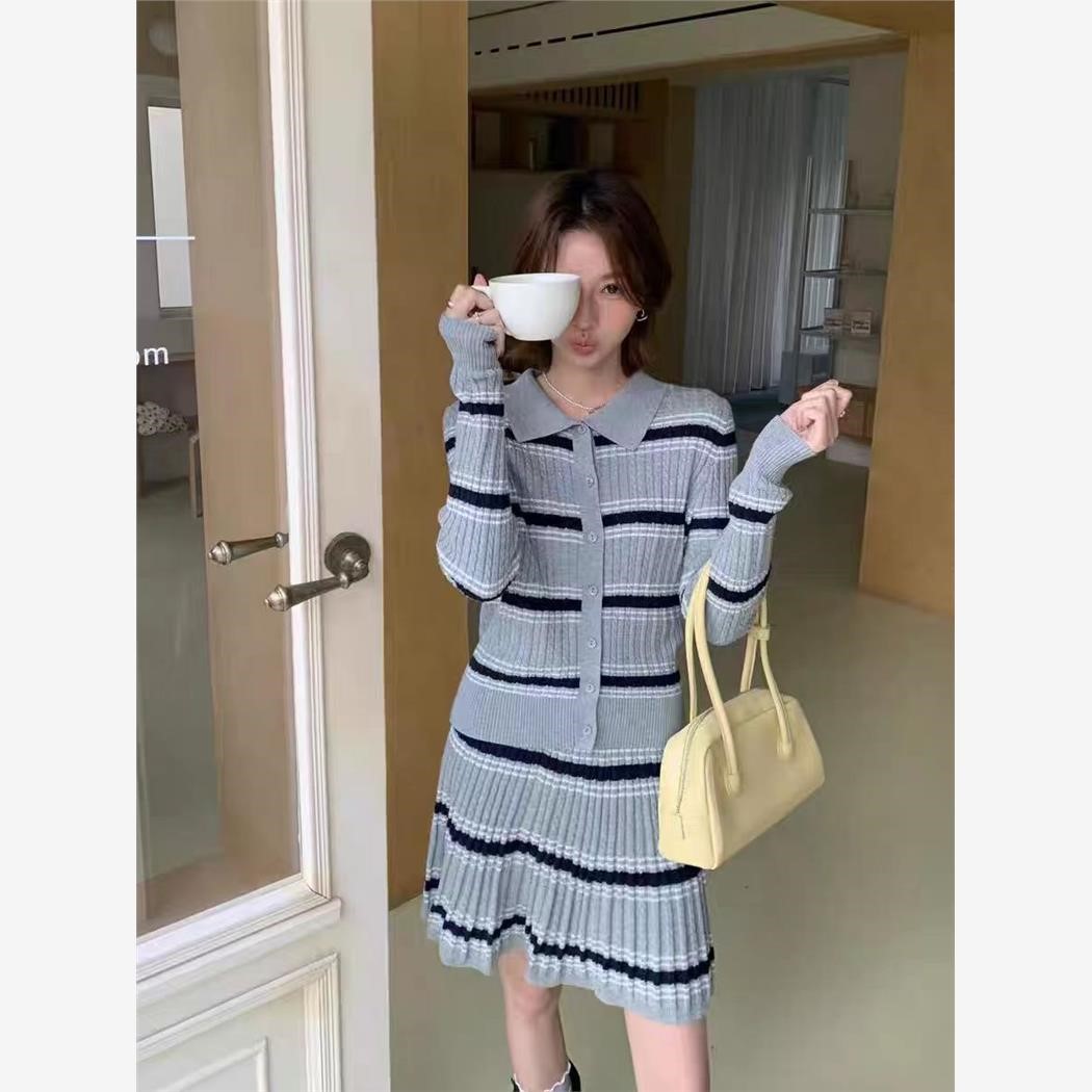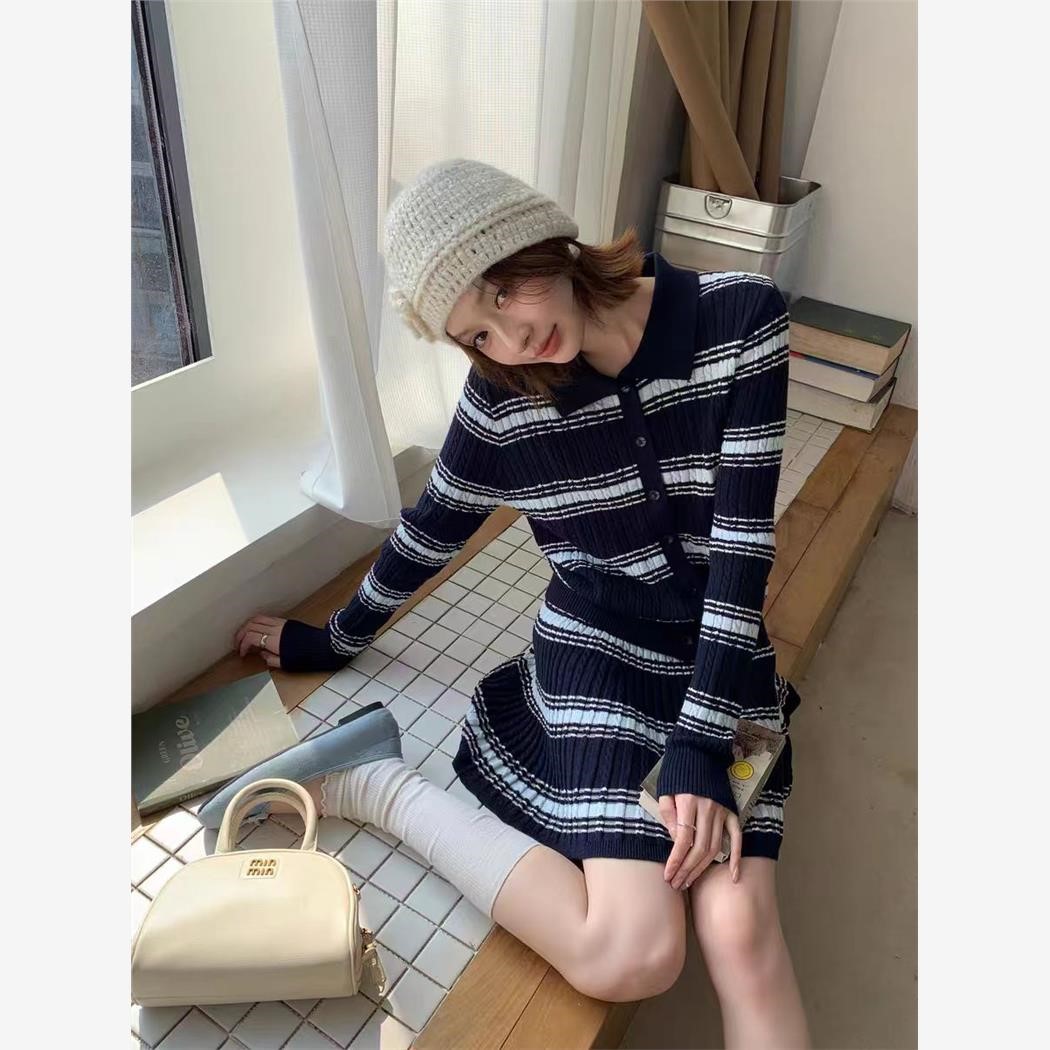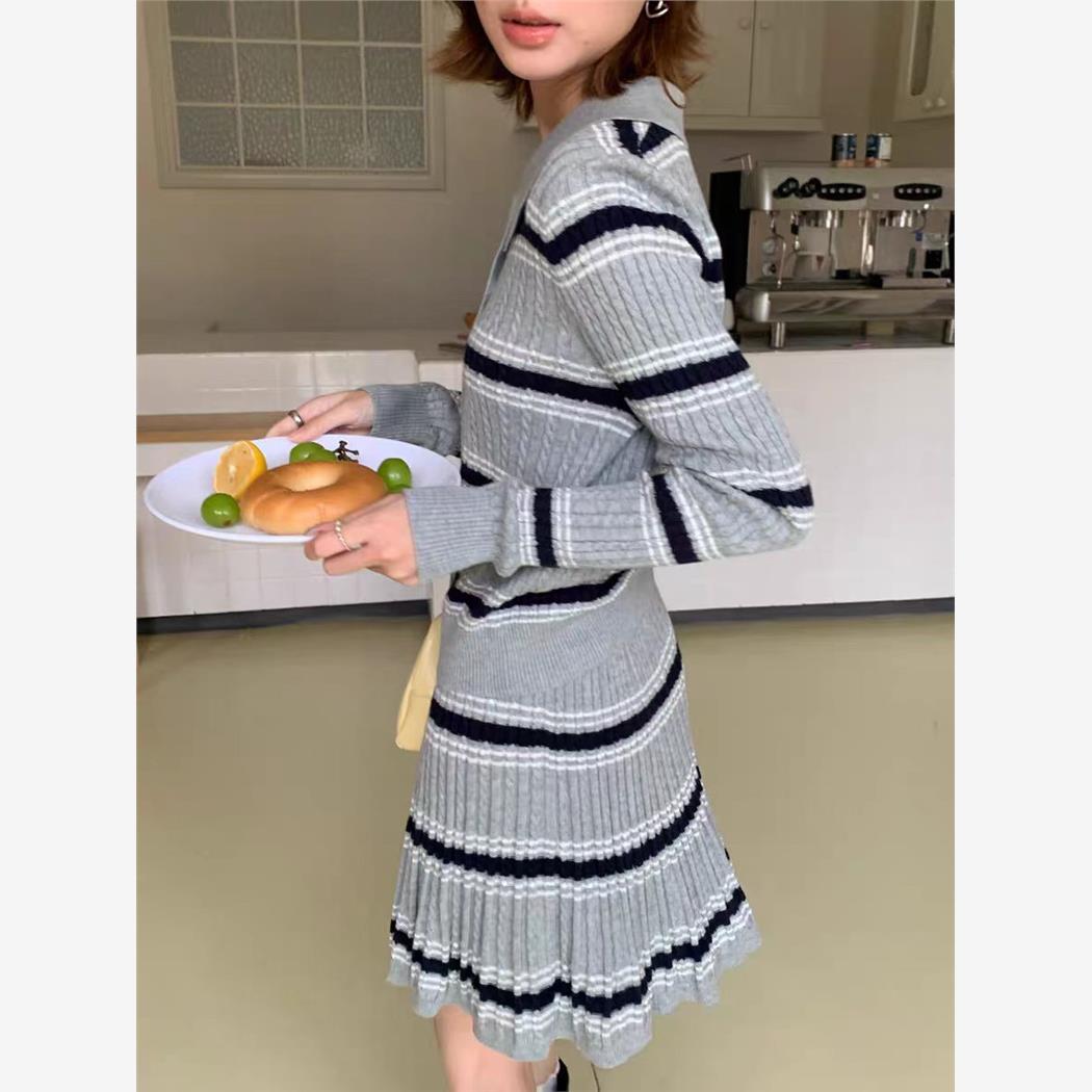 韩系休闲条纹针织套装女25秋冬新款polo针织开衫半身裙毛衣两件套