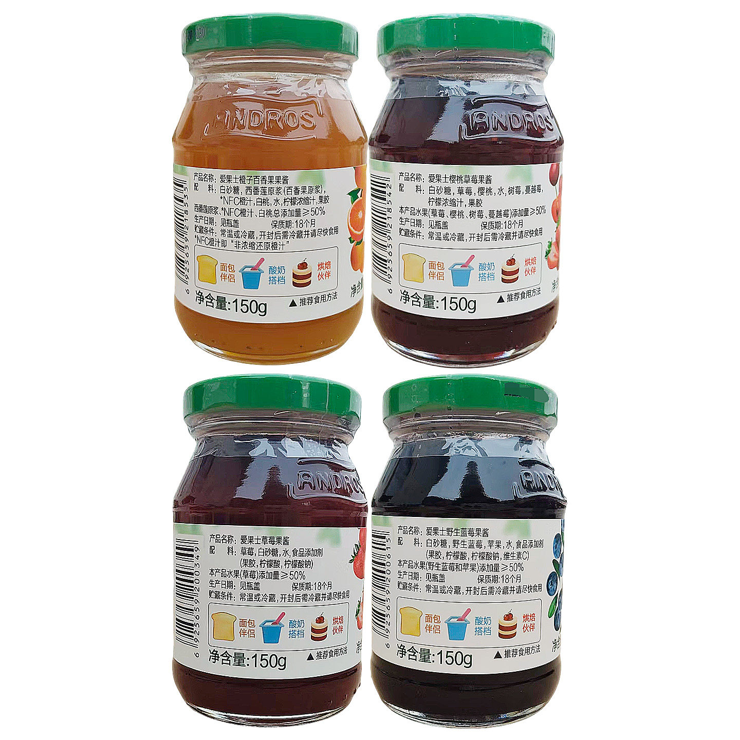 安德鲁爱果士草莓果酱150g蓝莓橙子百香果樱桃水果酱涂抹面包烘焙