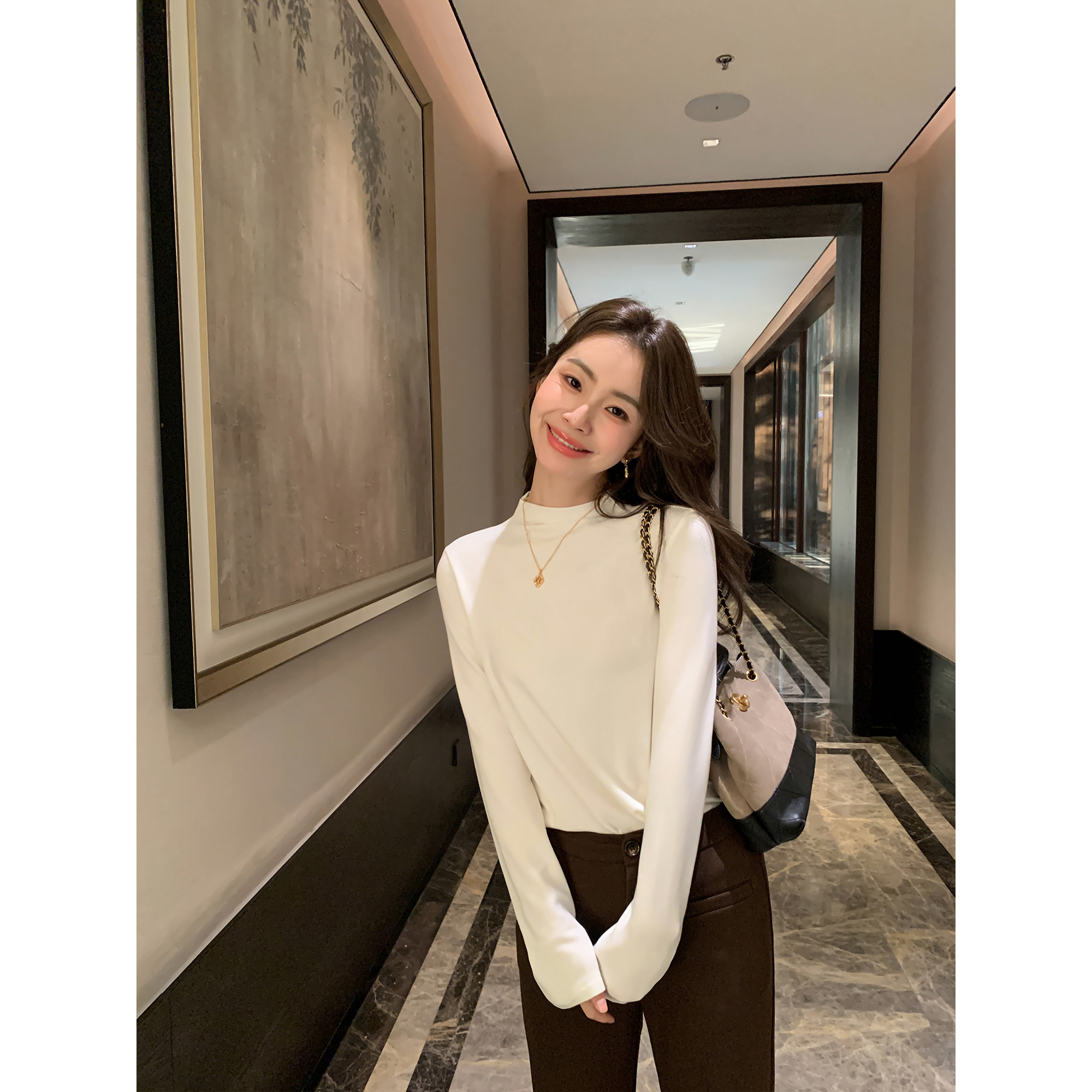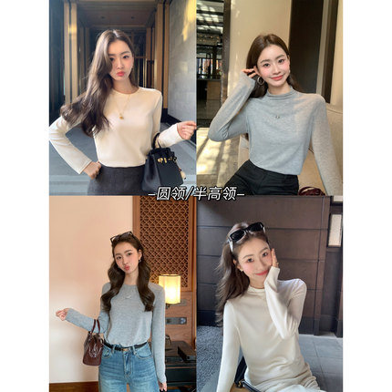 pusumede软弹空气 简约半高领针织打底衫女基础款宽松长袖T恤上衣