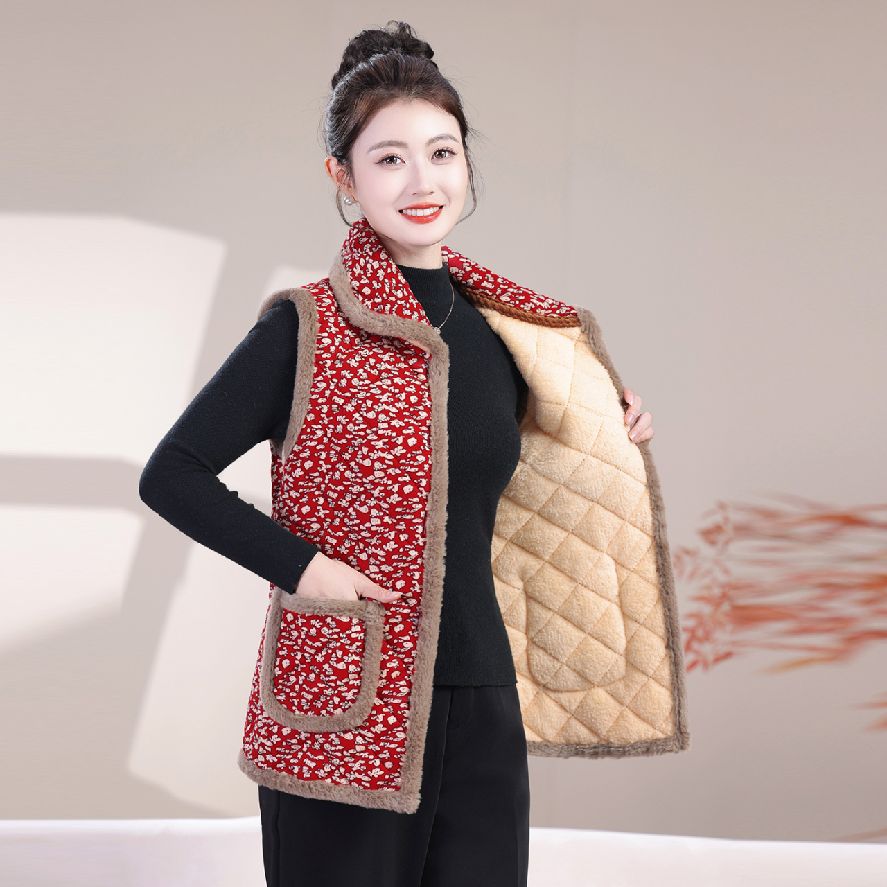 中老年女装妈妈装碎花棉袄秋冬装加绒加厚短款大码翻领马夹冬马甲