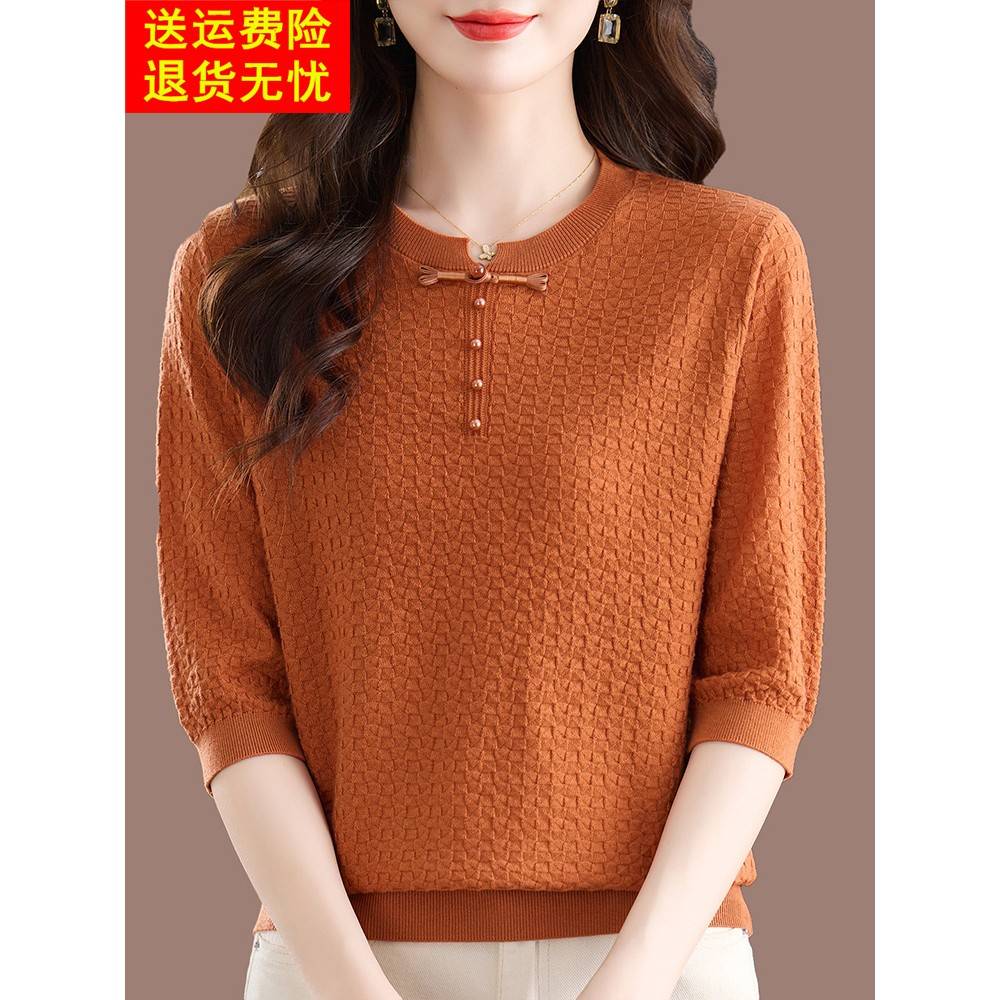 早秋薄款七分袖桑蚕丝t恤女秋季新款洋气宽松圆领半袖针织打底衫