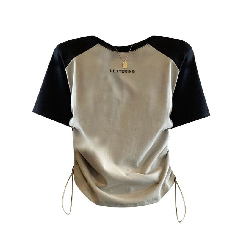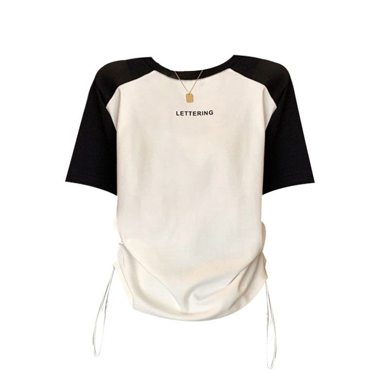 清仓秒杀~品牌折扣专柜撤回女装圆领印花抽绳短袖T恤显瘦正肩上衣