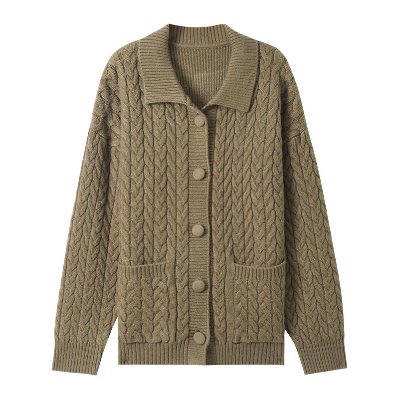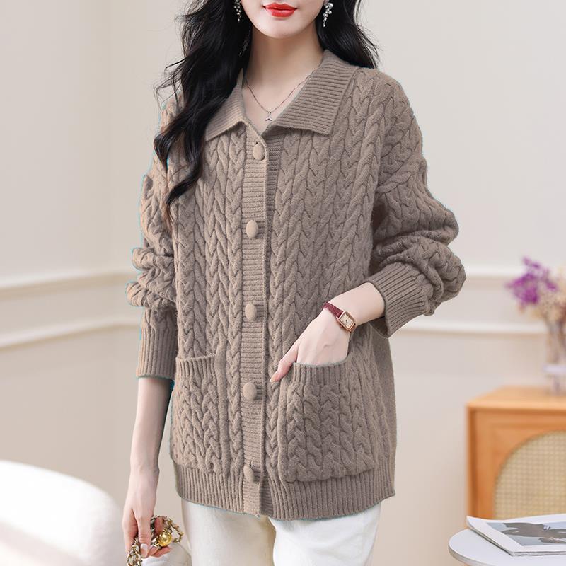 麻花针织开衫女秋冬款中老年妈妈羊毛衫宽松大码洋气翻领毛衣外套