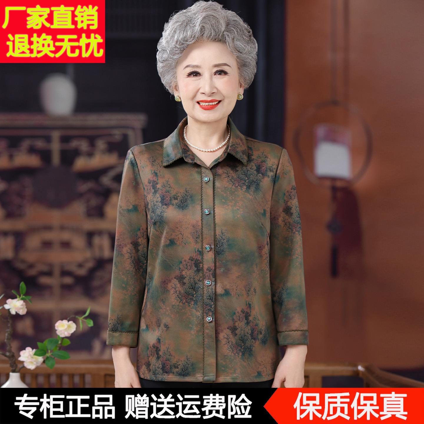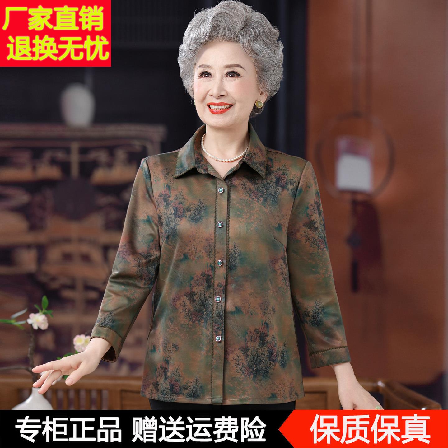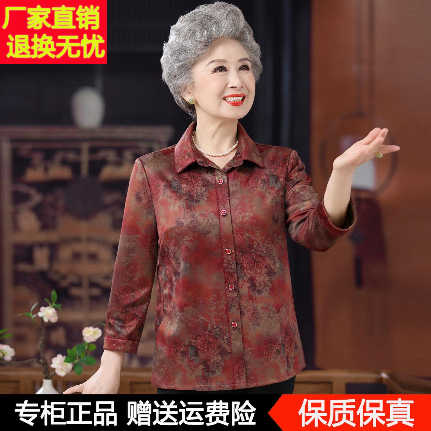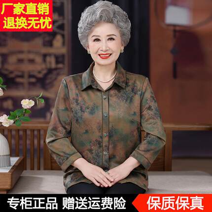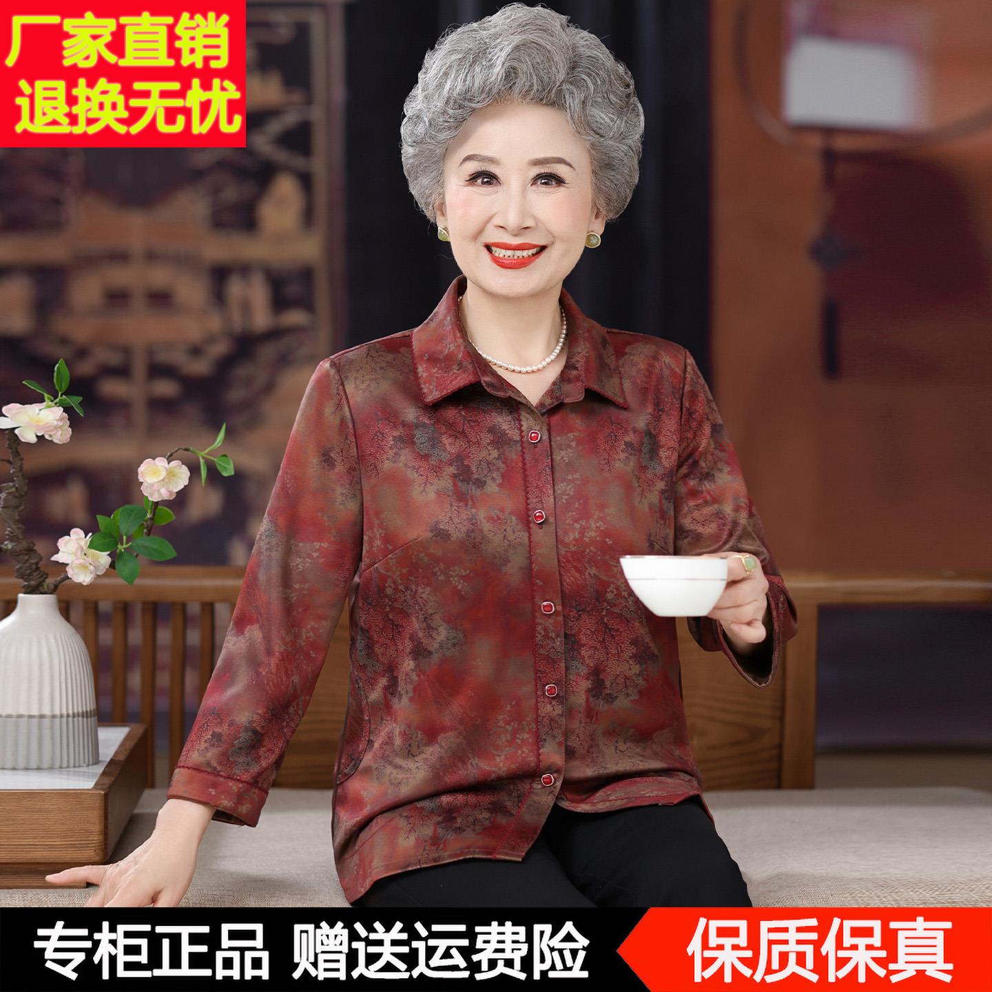 老年人秋装女奶奶桑蚕丝衬衫翻领上衣服妈妈春秋衬衣老人长袖外套