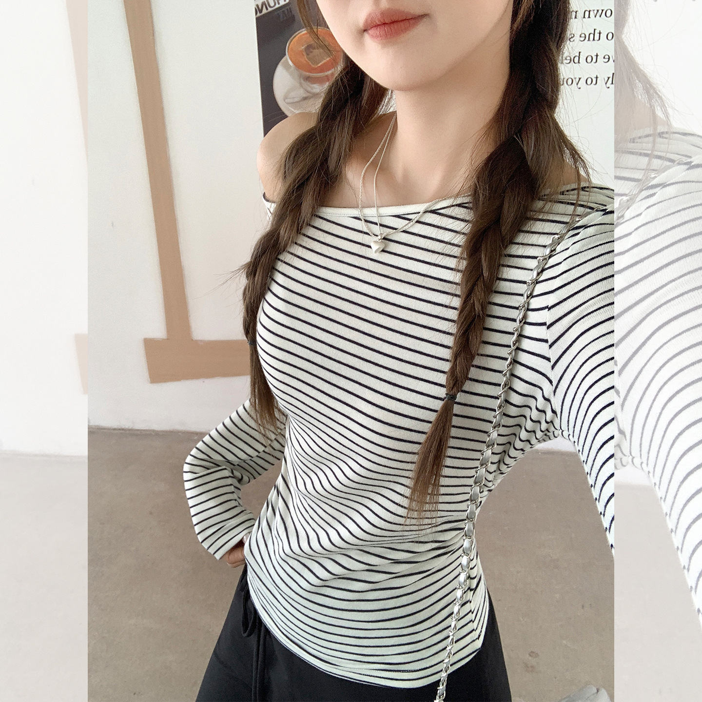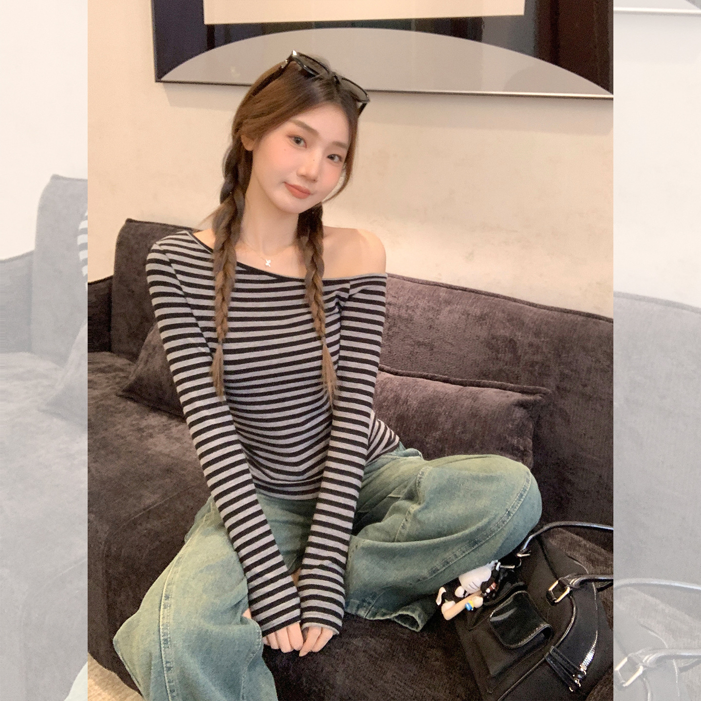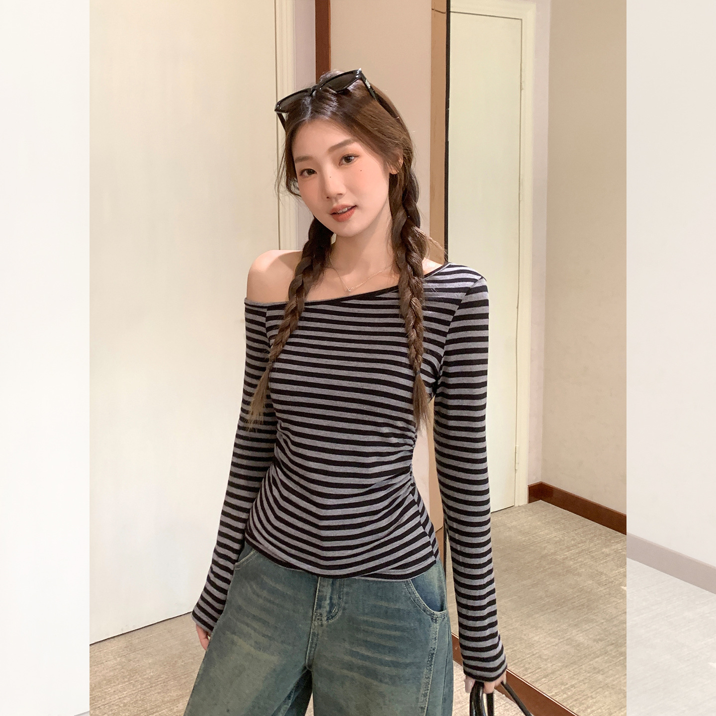 黑灰条纹斜肩露肩长袖打底衫T恤女2025早秋穿搭褶皱修身内搭上衣