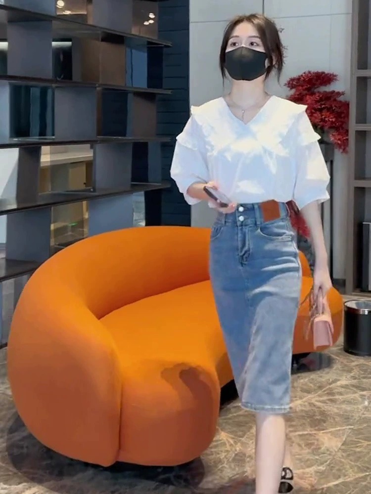 2025夏季新款茶系穿搭一整套上衣牛仔半身裙子盐系轻熟两件套装女