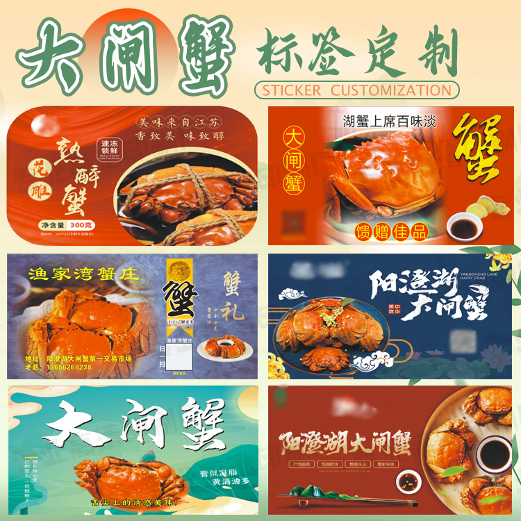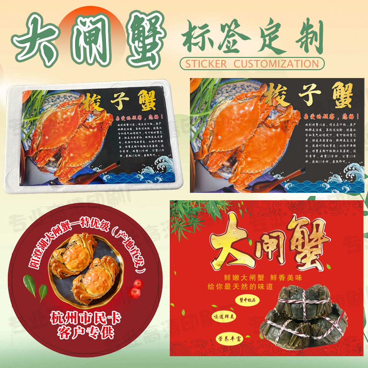 定制大闸蟹标签海鲜礼盒贴纸阳澄湖螃蟹皇帝蟹红花蟹不干胶贴印刷