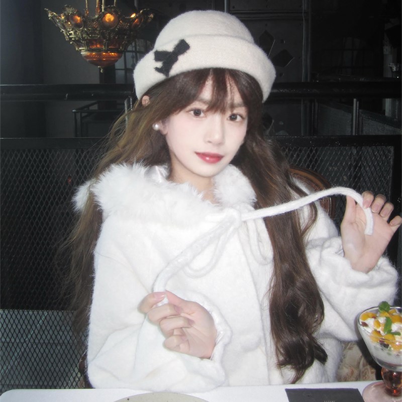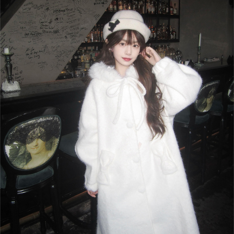 日系温柔风白色连帽毛呢外套女2025冬季高级感中长款软糯呢子大衣