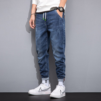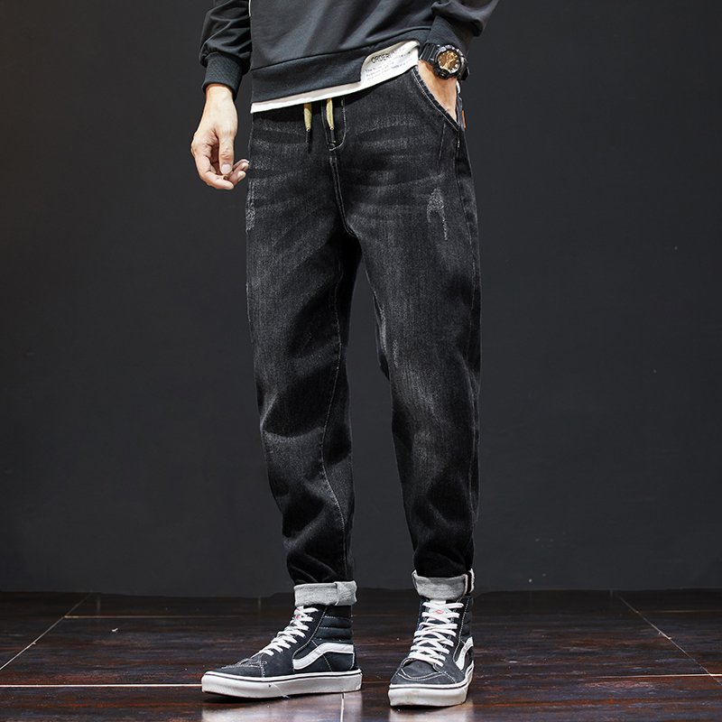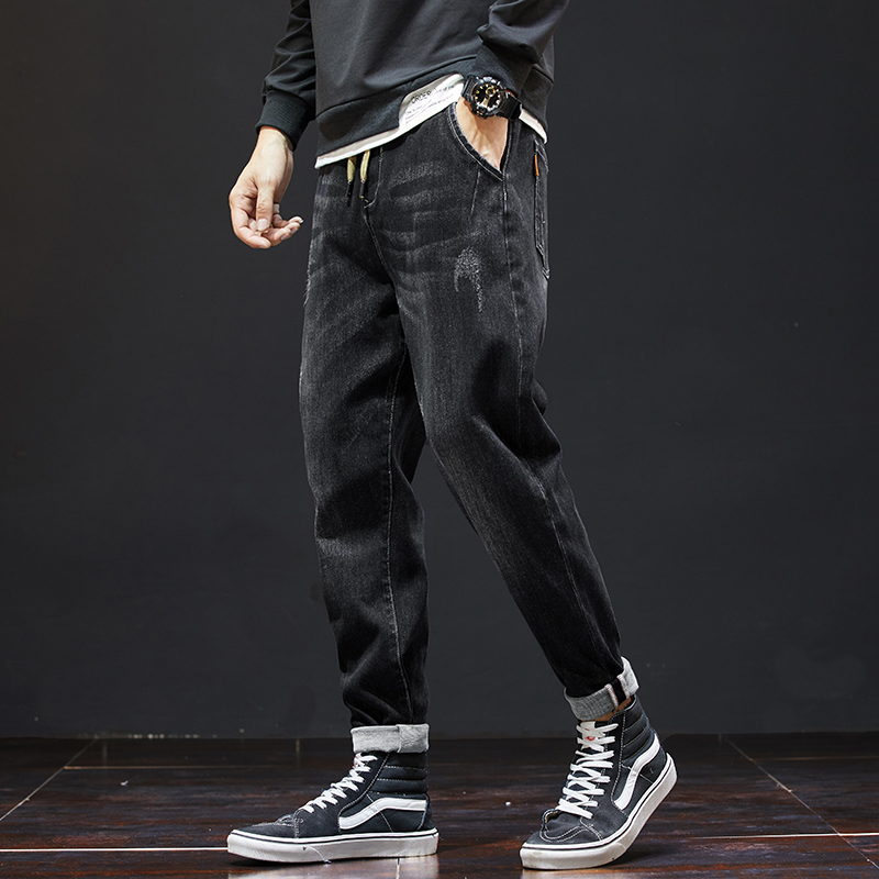 牛仔裤男宽松小脚加肥大码裤子男春秋款松紧腰百搭胖子黑色牛仔裤