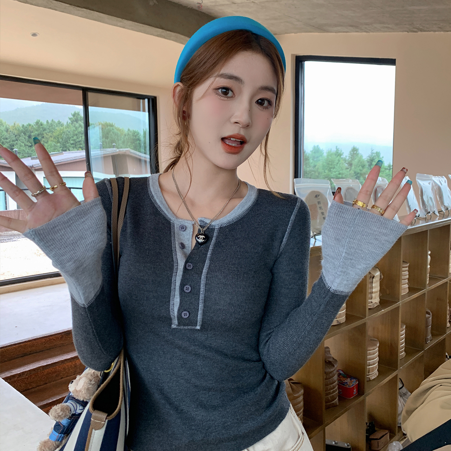 咖色假两件长袖针织衫女内搭2025早秋季新款设计感打底修身小上衣
